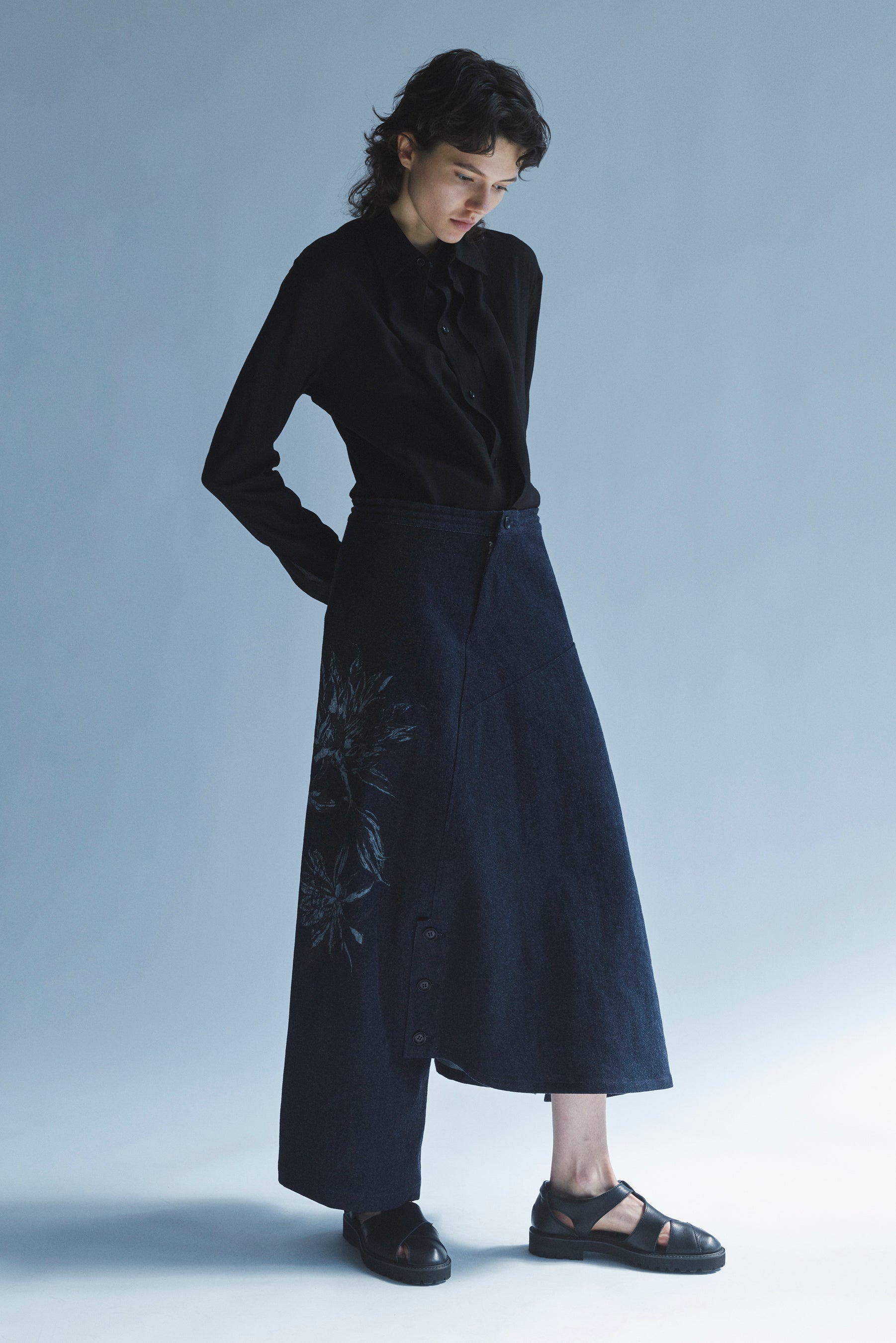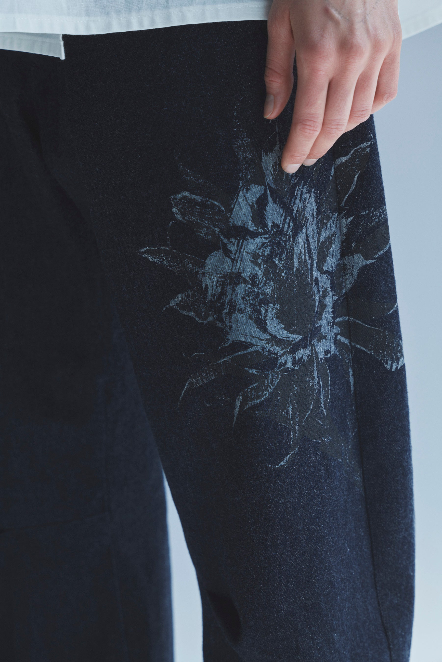 パンツとスカートを組み合わせたようなユニークなかたちのパンツ。左足首が覗く肌の見え方がワイズらしい重いシルエットに軽さを生む。右側面にサボテンの花のプリント。