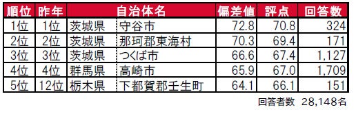 上位3位は昨年と同じく全て茨城県の自治体で、更に上位2位までは偏差値70以上の高い評価を得ています。