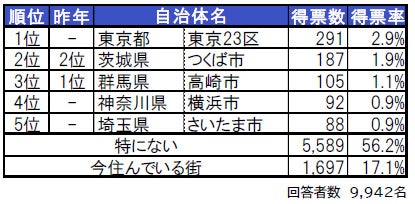 昨年は北関東内の自治体のみを対象として集計していましたが、今年は全国の自治体を対象とした結果、上位5自治体のうち3自治体(東京23区、神奈川県横浜市、埼玉県さいたま市)が北関東以外の街という結果となっています。