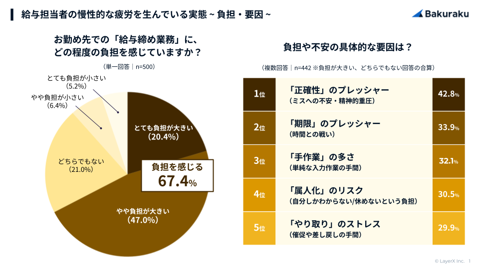 「給与締め業務」に約7割が「負担」を感じると回答。主な要因は1位「正確性のプレッシャー」(42.8%)、2位「期限のプレッシャー」(33.9%)