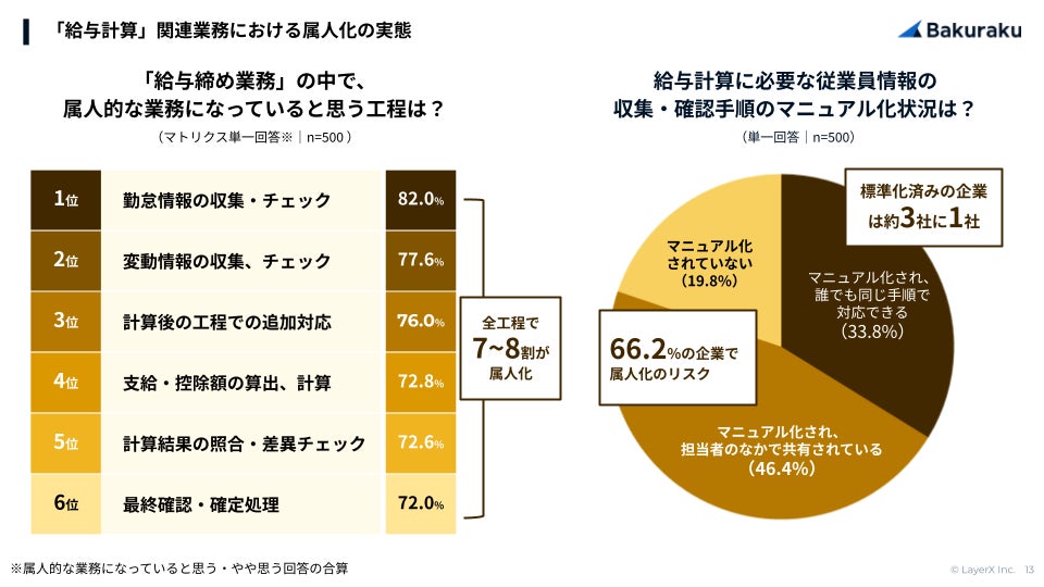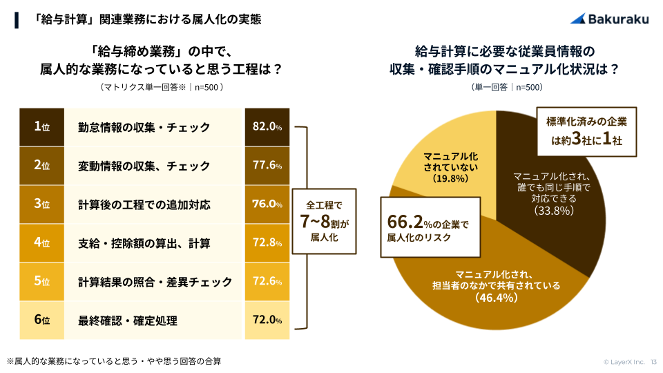 給与締め業務の全工程で7〜8割が「属人的になっている」と回答。従業員情報の収集・確認手順のマニュアル化では6割以上が属人的なリスクを抱える