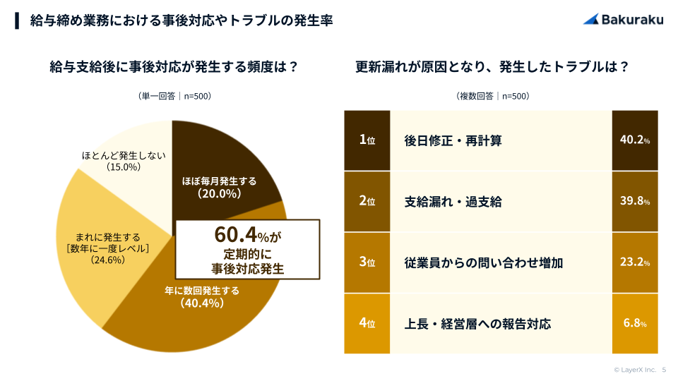 給与支給後に修正・問い合わせ対応などの事後対応が「定期的に発生する」と回答したのは60.4%。「後日修正・再計算」40.2%、「支給漏れ・過支給」39.8%など金銭に直結するトラブルを約4割の企業が経験している