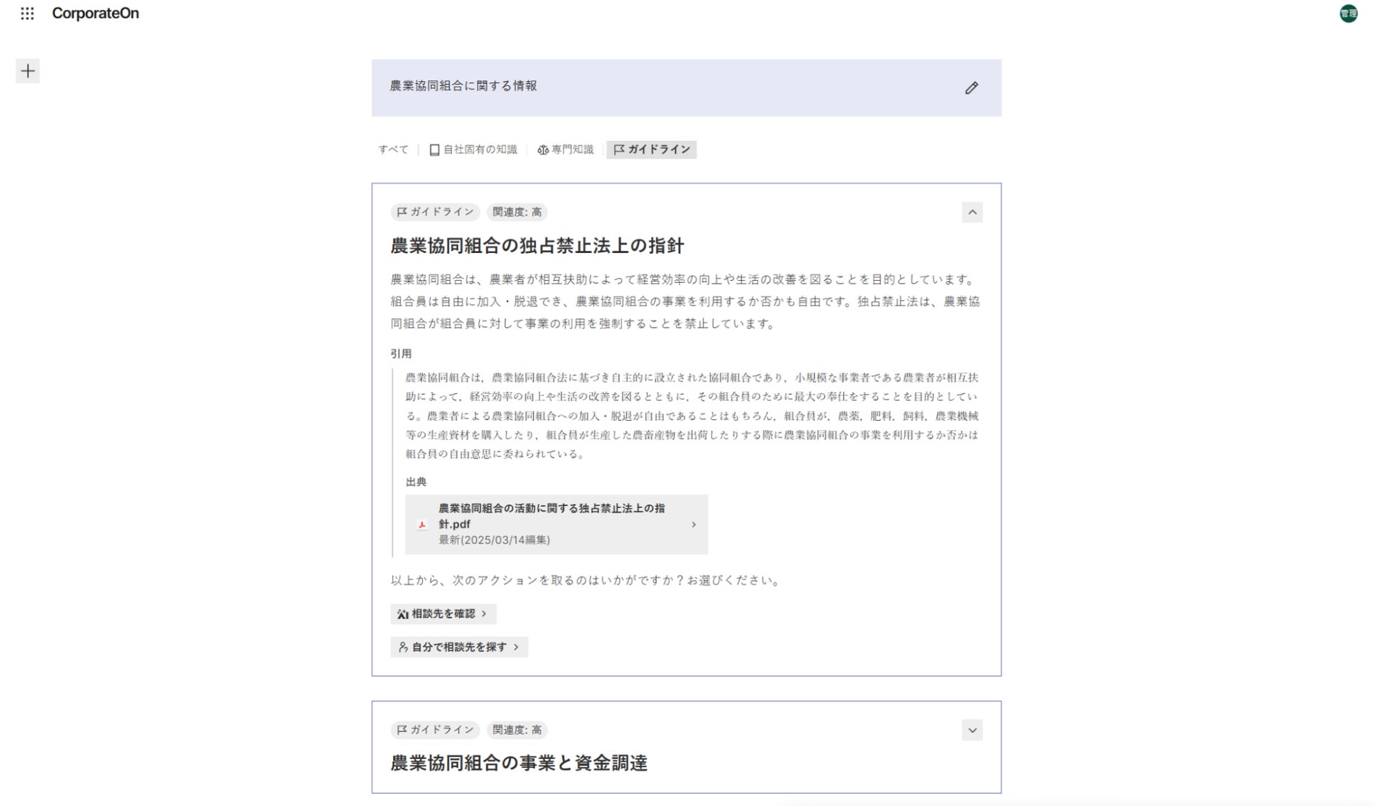 ■「CorporateOn」、官公庁のガイドライン・Q&Aを搭載し、これらの情報を元にAIが質問に対する回答を数秒で生成