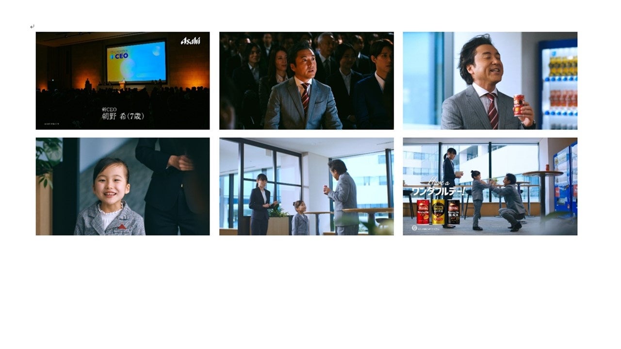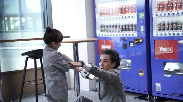 新社長就任会見の後、休憩所の自動販売機で買った「ワンダ」を片手に「すごい時代になったなあ」と気持ちを整理する湾田に「缶コーヒーお好きなんですか?」と話しかける新社長。朝のルーティンとして『ワンダ モーニングショット』を飲んでいることを湾田が伝えると「私にもルーティンあります」と返す新社長。その後、新社長のルーティンである「高速アルプス一万尺」を楽しそうに二人でしている様子を描くことで「ワンダ」の広告メッセージである「Have a ワンダフルデー!」を表現しています。