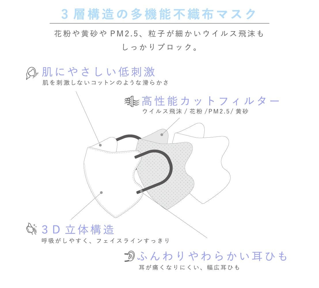 3レイヤー構造になっており、高性能カットフィルターがウイルスや花粉などを平均99%カットしてくれます。