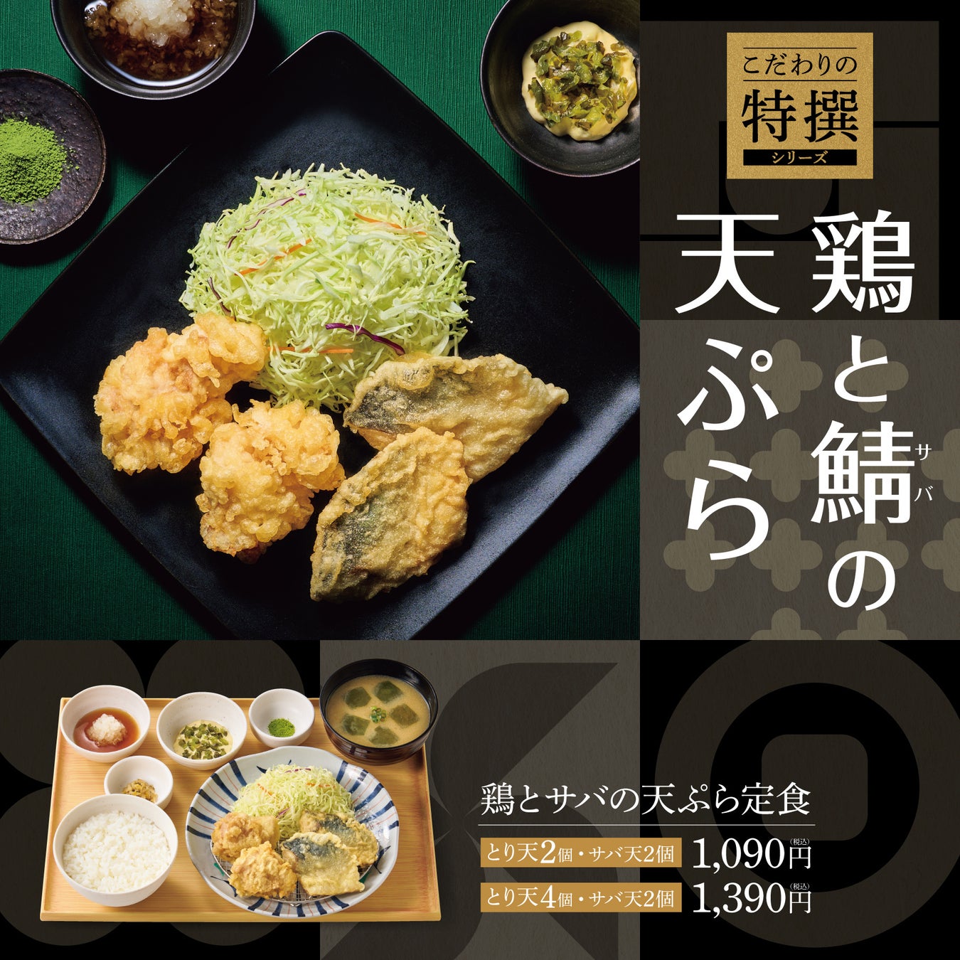 こだわりの特撰シリーズから『鶏とサバの天ぷら定食』が新登場。とり天に使用している茨城県産つくば鶏は、豊かな自然環境の中で、抗菌性物質の添加を一切行わず、厳格な飼育管理のもと大切に育てられ、おいしさと安全を追求しています。サバ天のサバは、北海道にて水揚げされたサバを使用。脂の乗った肉厚な食感が特徴です。このとり天とサバ天の素材を引き立てるおすすめの食べ方として、鮮やかな彩りと薫り高い風味が特徴の宇治抹茶とまろやかな味わいの沖縄県産焼塩をブレンドした【抹茶塩】、かつおの風味と昆布の旨味をきかせた本醸造しょうゆを使用した甘口の【天つゆ・おろし】、コク深いタルタルソースに、しば漬の風味と食感を楽しむことができる【青しばタルタル】をご用意いたしました。3つの食べ方でぜひお楽しみください。