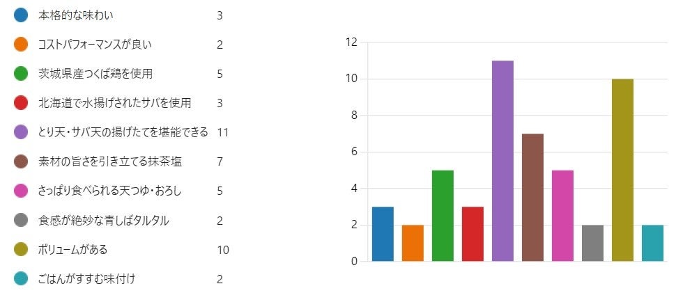 最も多くの票を集めたのは『とり天・サバ天の揚げたてを堪能できる』というポイントでした。2位は『ボリュームがある』、3位は『素材の旨さを引き立てる抹茶塩』でした。
