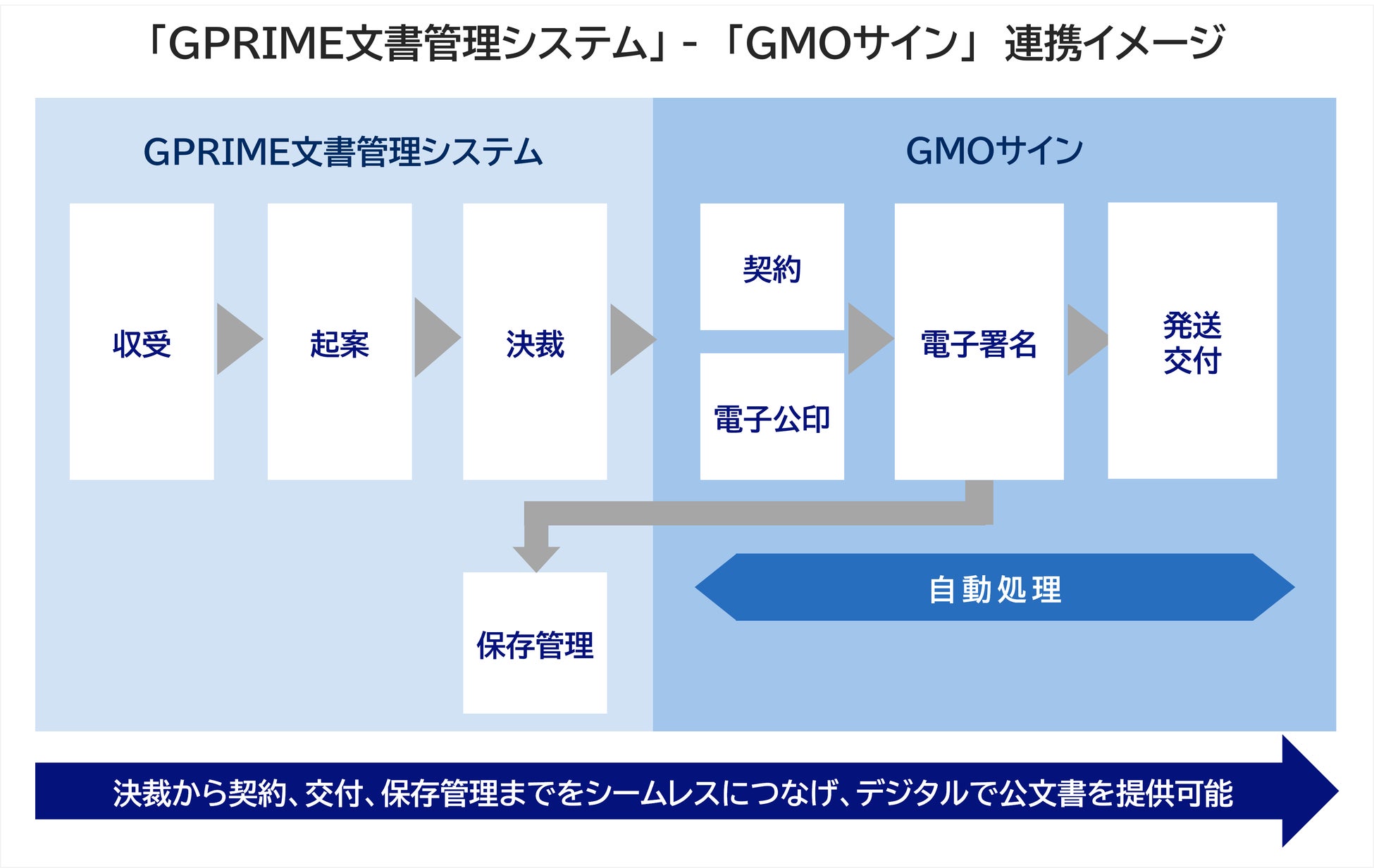 これに伴い両社は、NECが提供する「GPRIME(ジープライム)文書管理」と、GMOグローバルサイン・HDが提供するクラウド型電子契約サービス「電子印鑑GMOサイン」(以下、GMOサイン)および、自治体の処分通知を電子化する「GMOサイン電子交付」を連携することを決定いたしました。