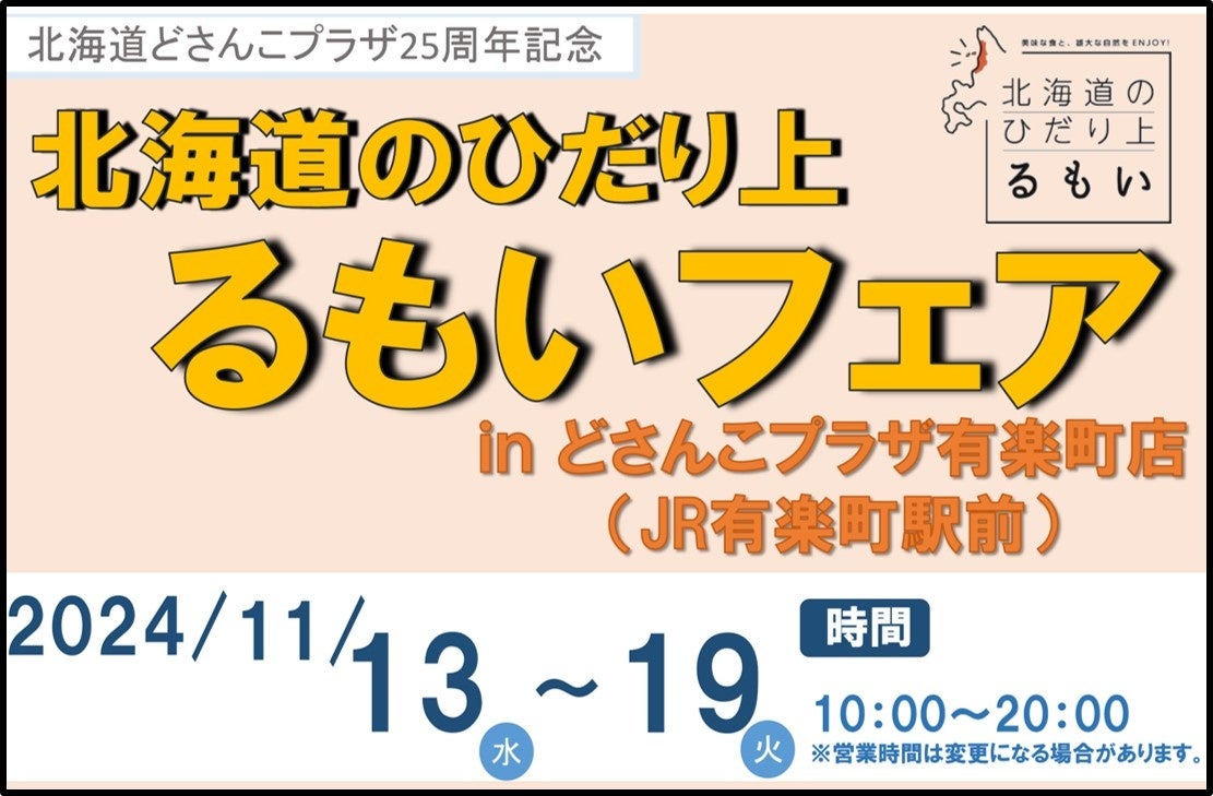 そんな留萌地域の特産品を販売する『北海道のひだり上 るもいフェア』を、11月13日(水)~19日(火)に、北海道どさんこプラザ有楽町店で開催します。