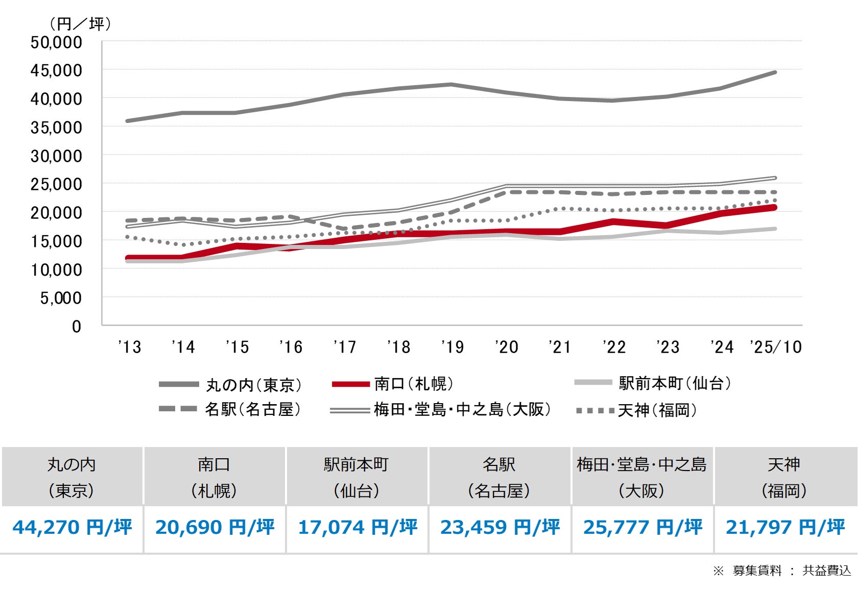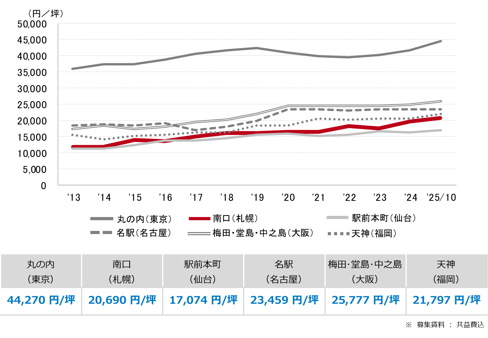 三幸エステート株式会社(本社:東京都中央区、取締役社長:福島正二郎)は、2025年10月度の札幌市オフィス賃貸状況(空室率&現空面積:全規模、募集賃料&募集面積:全規模、規模別空室率、主要エリア※1空室率:全規模)および全国6大都市(東京・札幌・仙台・名古屋・大阪・福岡)の大規模ビルのマーケットデータをまとめた「オフィスマーケット2025年11月号札幌」を公表します。