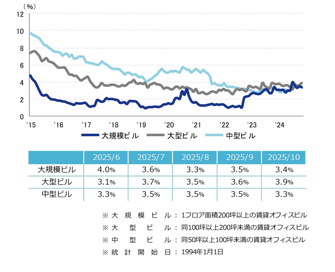 空室率は前月比マイナス0.04ポイントの3.41%と、前月から小幅な低下となった。新築ビルへ移転したテナントの二次空室が生じた一方、館内増床や一時需要等で空室消化が進み、前月からはわずかな動きとなった。潜在空室率は前月比マイナス0.01ポイントの5.11%となり、前月からほぼ横ばいだった。