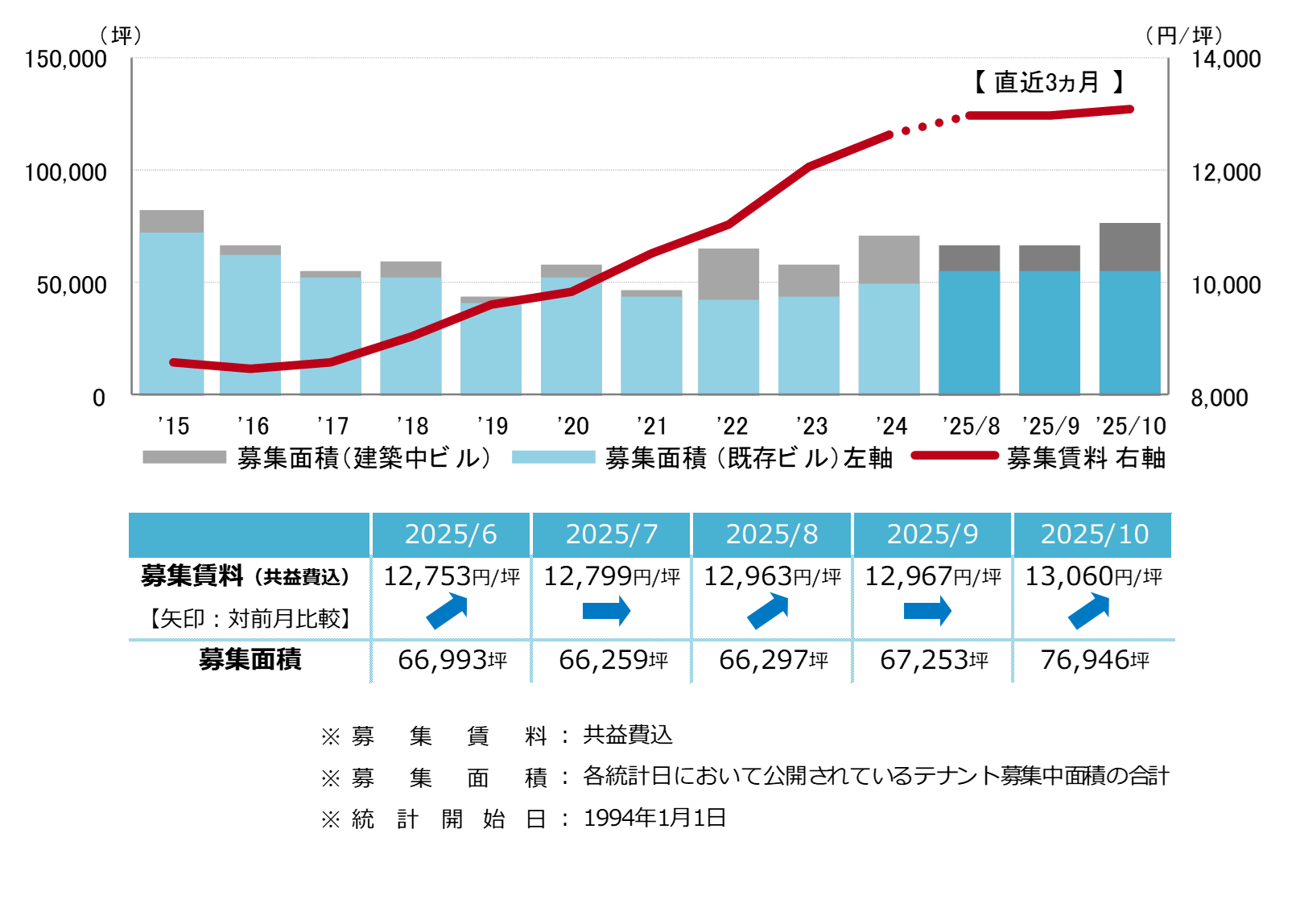 募集賃料は前月比プラス93円/坪の13,060円/坪と、5ヵ月連続の上昇となり、統計開始以来の最高値更新が続いている。