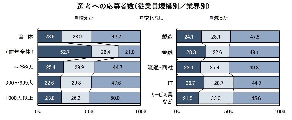 エントリー数、選考応募者数とも「減った」が「増えた」を大きく上回る。辞退者は増加