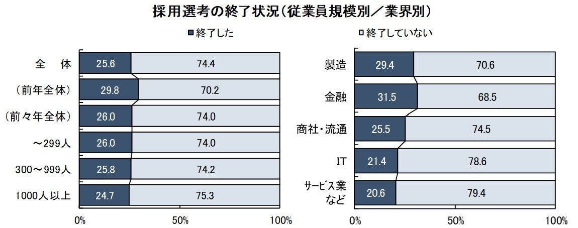 採用選考を終了した企業は全体の25.6%。充足率の平均は58.0%。いずれも前年を下回る