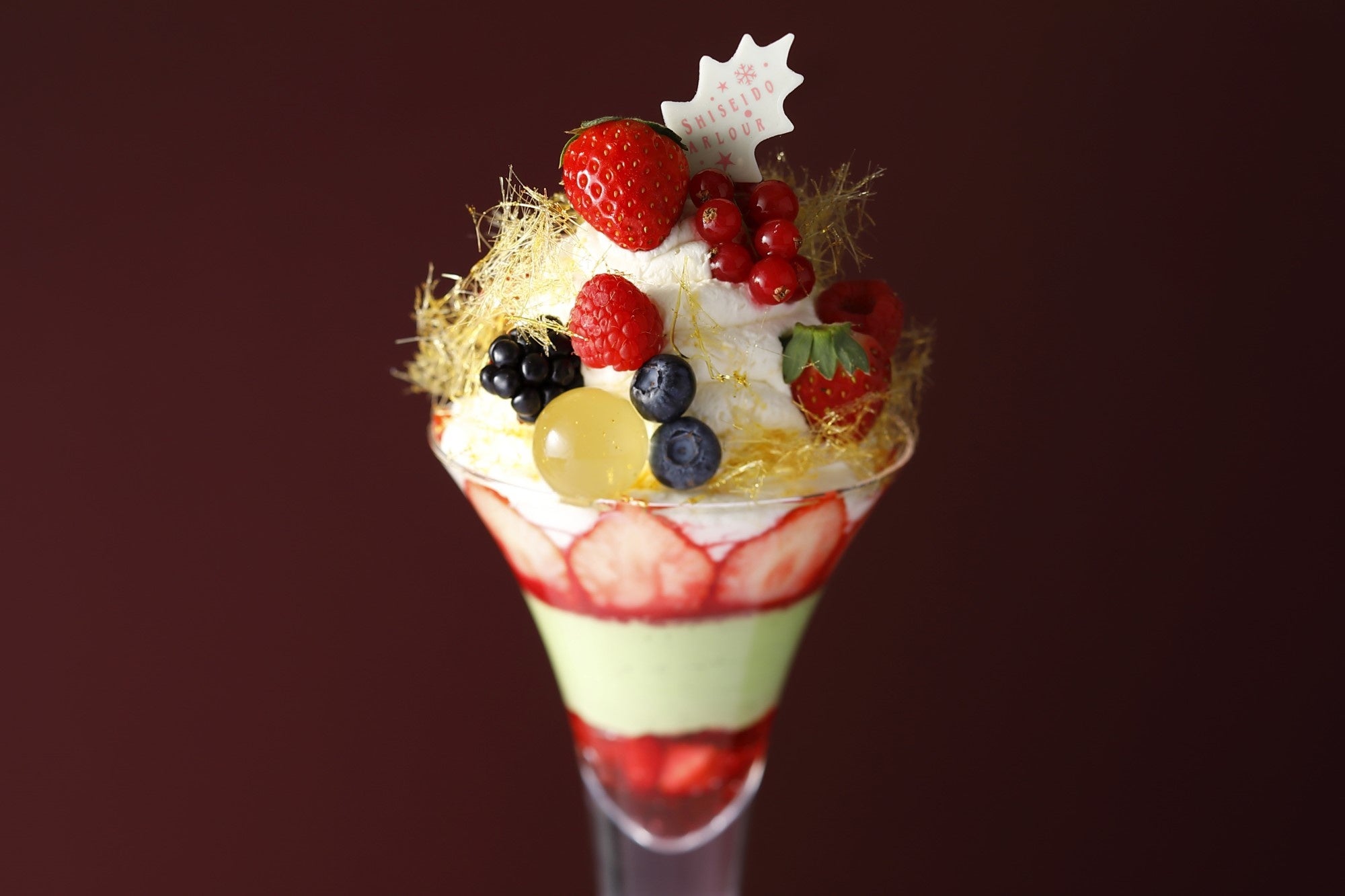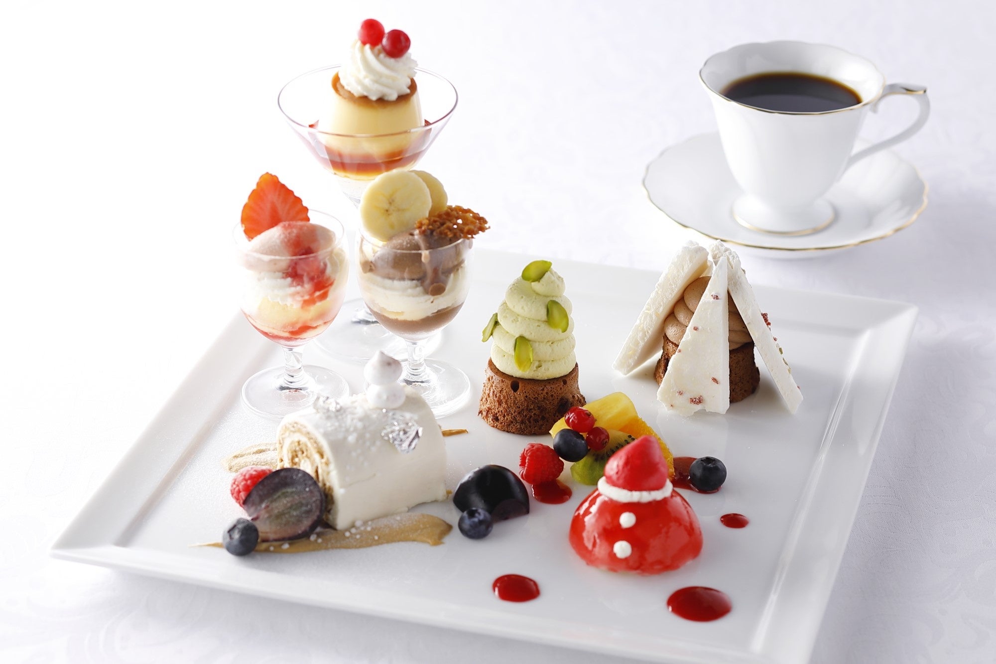 チョコレートクリームとクリスマスカラーのメレンゲに、ピスタチオクリームのツリー仕立て。ラズベリーのムースをサンタクロースの装いにして盛り付けられたこの時期限定のプレートに。資生堂パーラー定番のパフェやプリンもプティサイズでご一緒にお楽しみをいただける今月のデザートです。