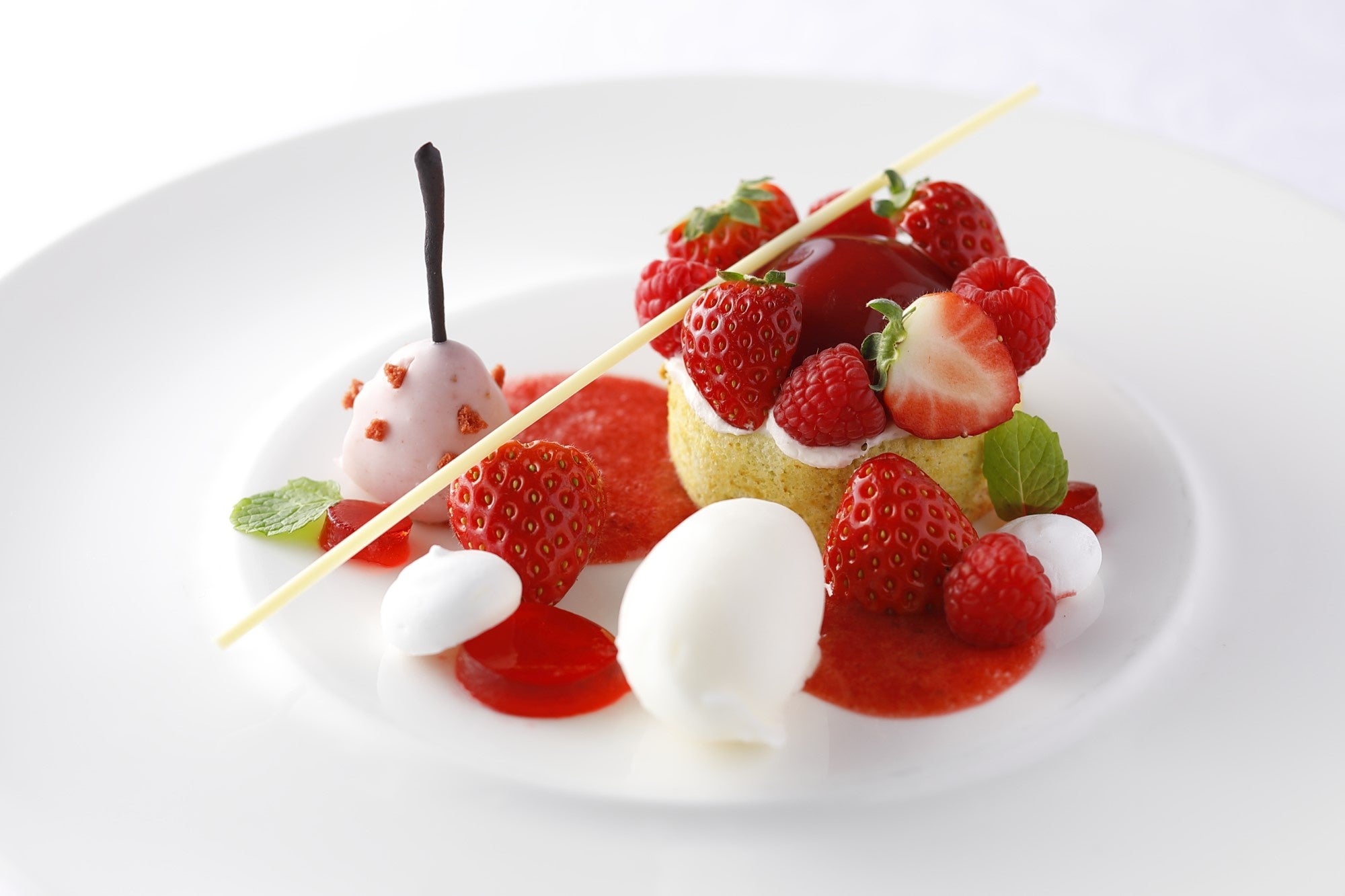 苺とベリーのジュレの上にピスタチオのロールケーキを乗せ、中には苺の生クリームが入っています。トップには再び苺とベリーのジュレをトッピング。フレッシュの苺やベリーと共にお楽しみください。また苺にイチゴチョコレートでコーティングしフリーズドライの苺を散りばめた一口デザートも添えました。