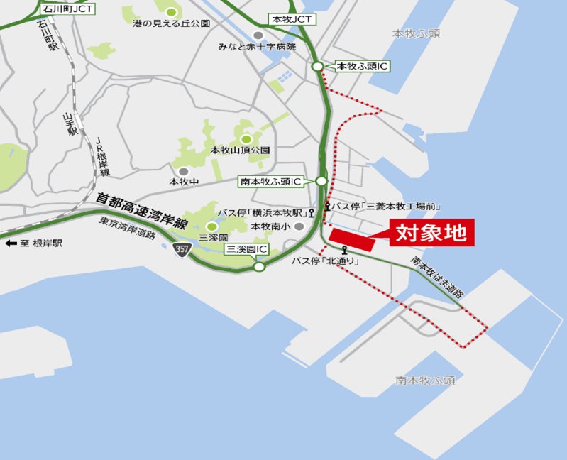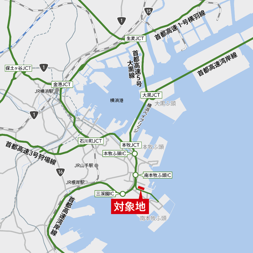 当施設は、横浜市中区に立地し、人口集積地である横浜市中心部へのアクセスが容易です。さらに、首都高速湾岸線「本牧ふ頭IC」から約2.7kmの位置にあることから、東京中心部や羽田空港へのアクセスにも優れています。工業専用地域にある立地のため24時間稼働が実現できるほか、国際貿易港である本牧ふ頭・南本牧ふ頭に隣接していることから、コンテナターミナルとの一体的運用にも適しています。