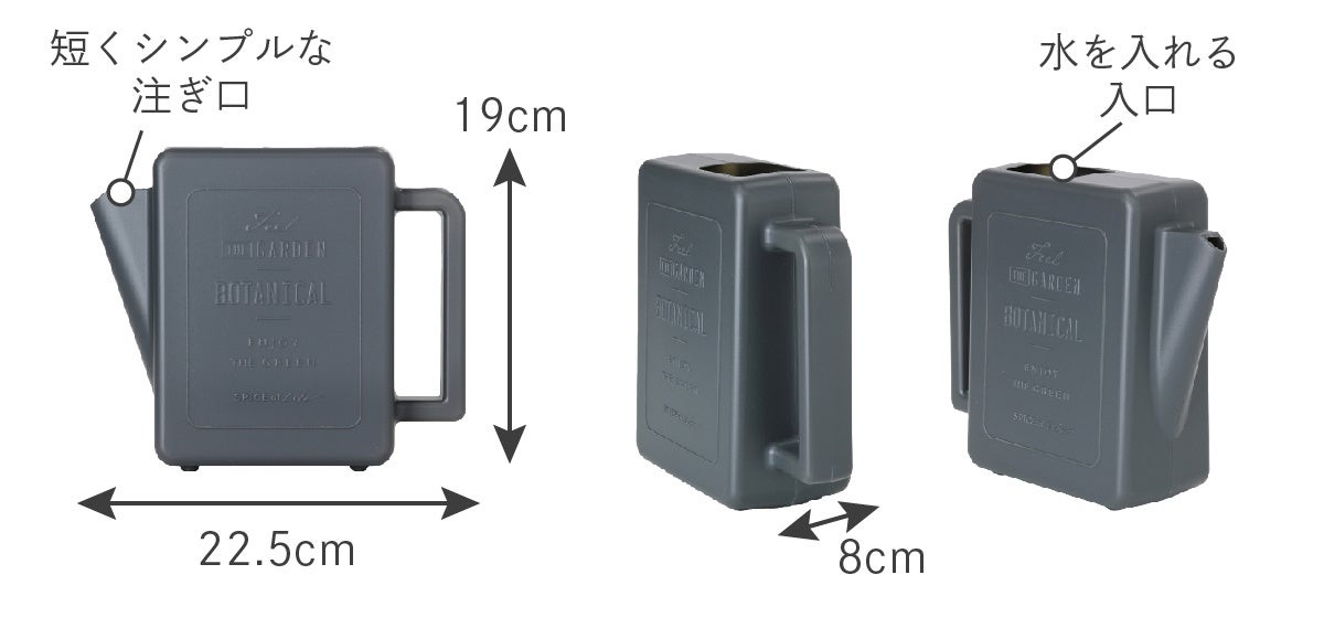 片手でしっかり持てる大きめな持ち手付きは水やりが安定して扱いやすいです。水の入れ口も大きめで入れやすく、容量は見た目以上の1.5L。植物への水やりだけでなく、加湿器の給水時にも便利です。