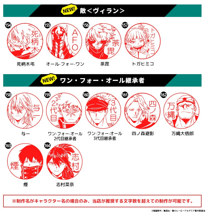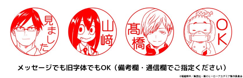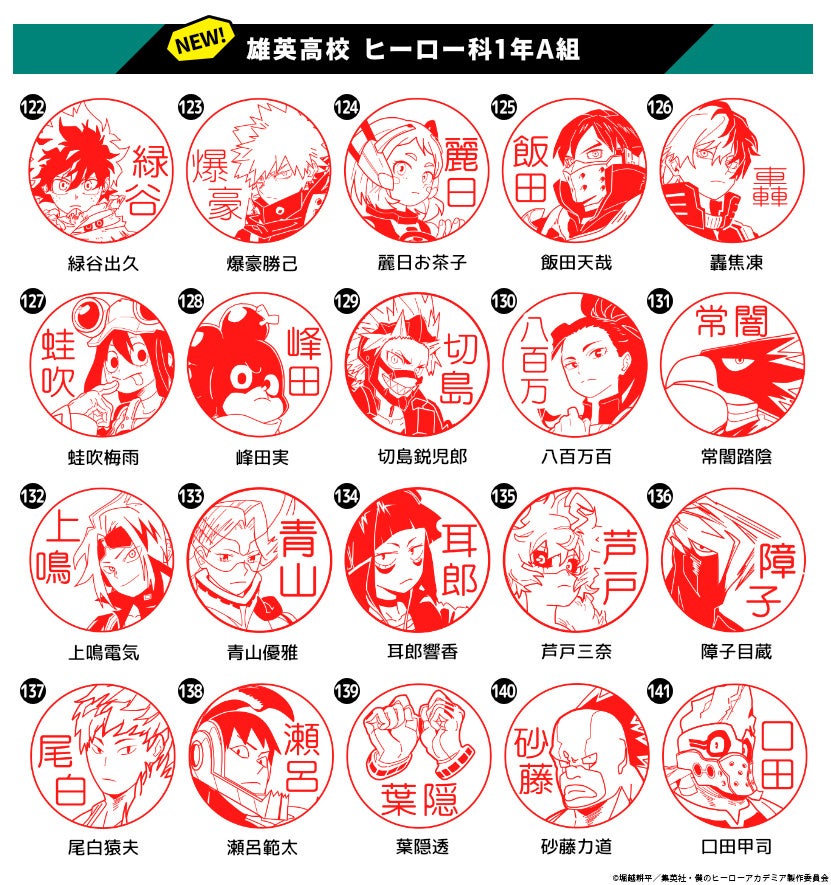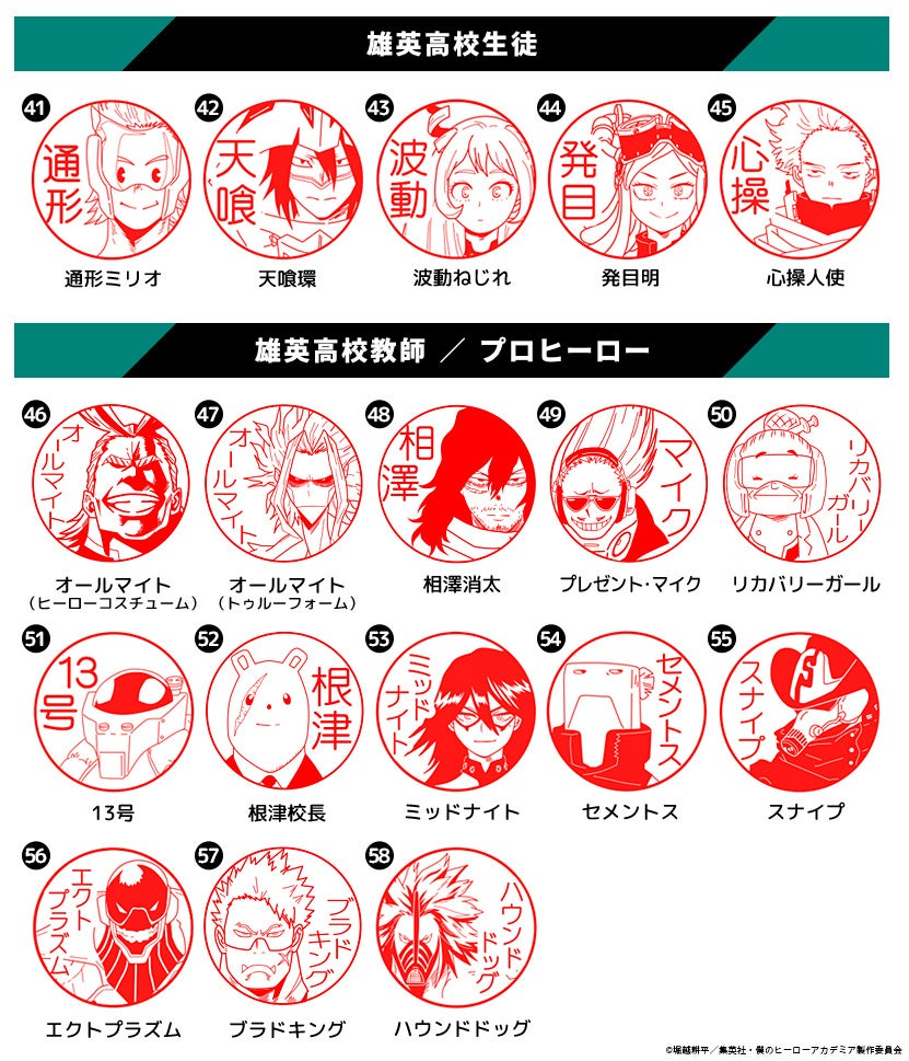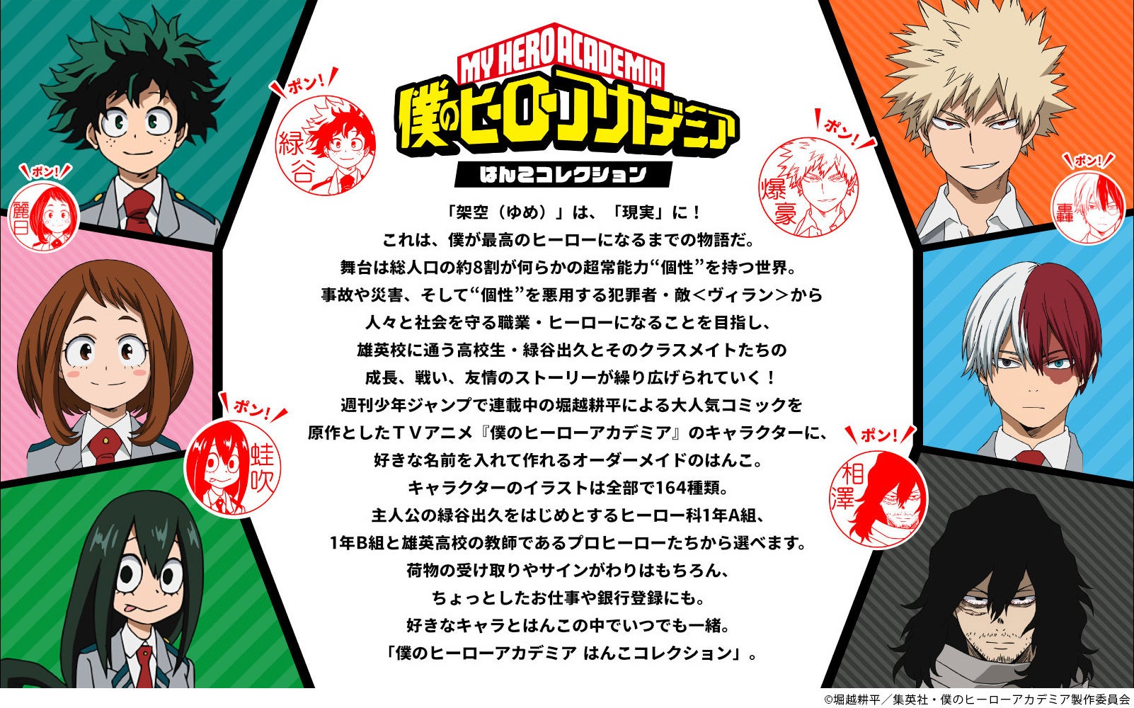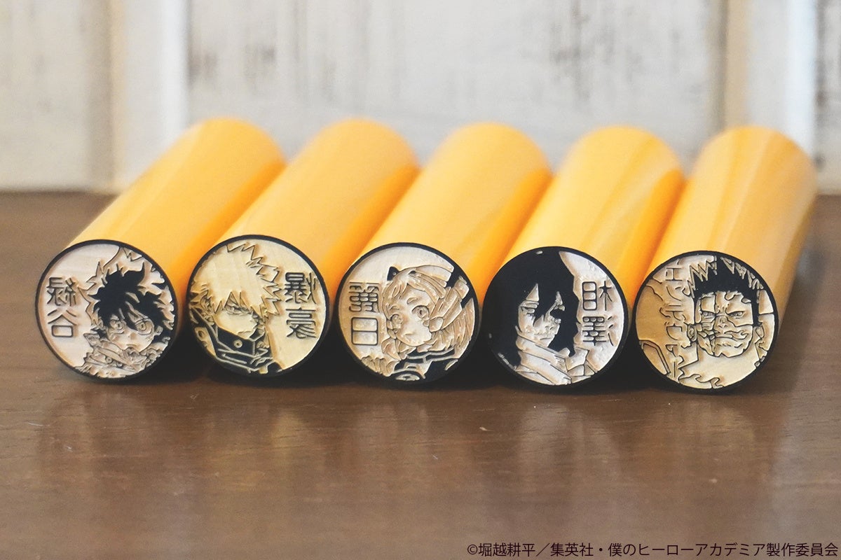 「僕のヒーローアカデミア はんこコレクション」は、コミックスの世界累計発行部数が1億部を突破、週刊少年ジャンプで8月5日に連載を完結したTVアニメ『僕のヒーローアカデミア』のお気に入りのキャラクターと好きな名前や文字でつくれるオーダーメイドのはんこ。雄英高校1年A組、1年B組の生徒からプロヒーロー、敵<ヴィラン>など、これまでSNSから寄せられたリクエストに応えて、キャラクタービジュアルを121種類まで増やしてまいりました。