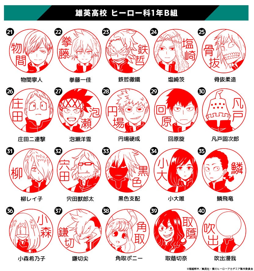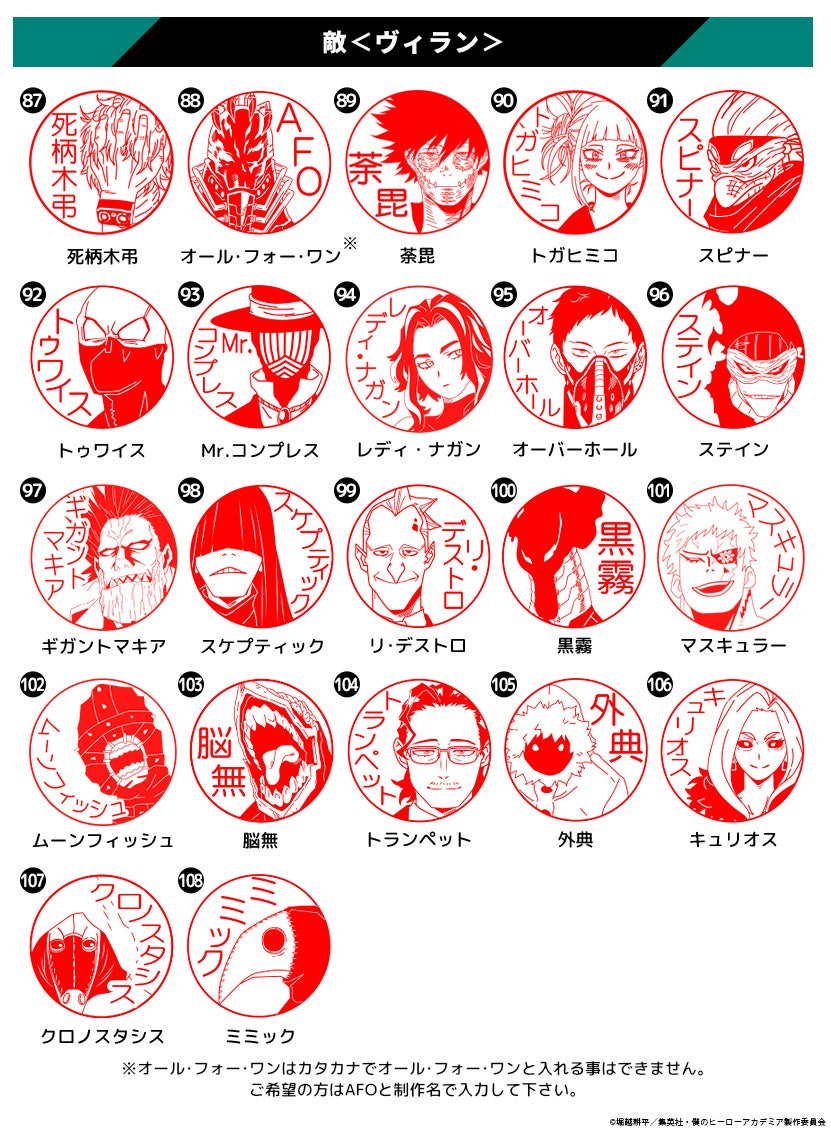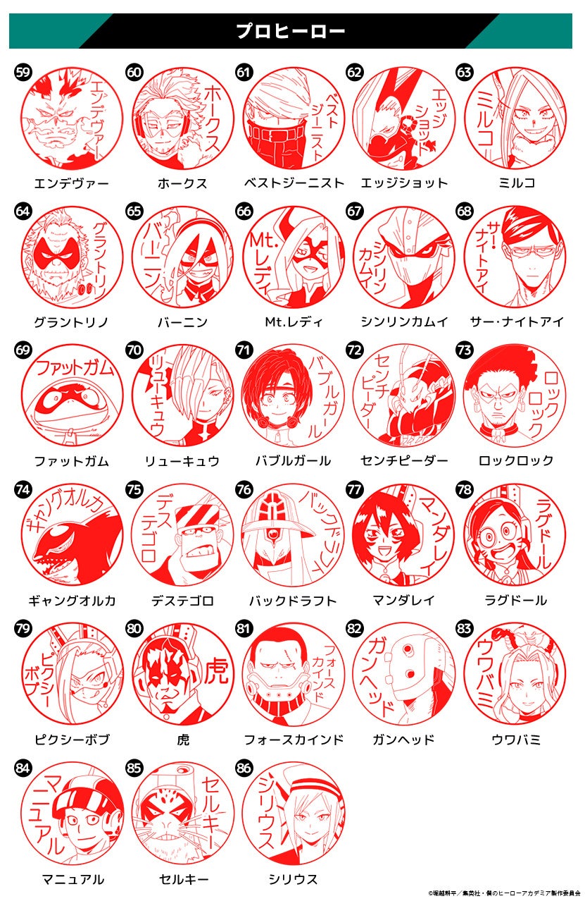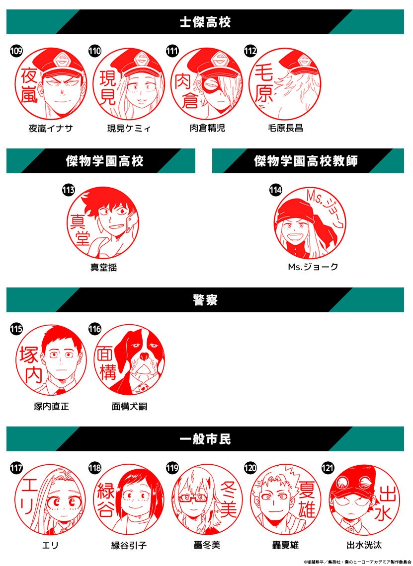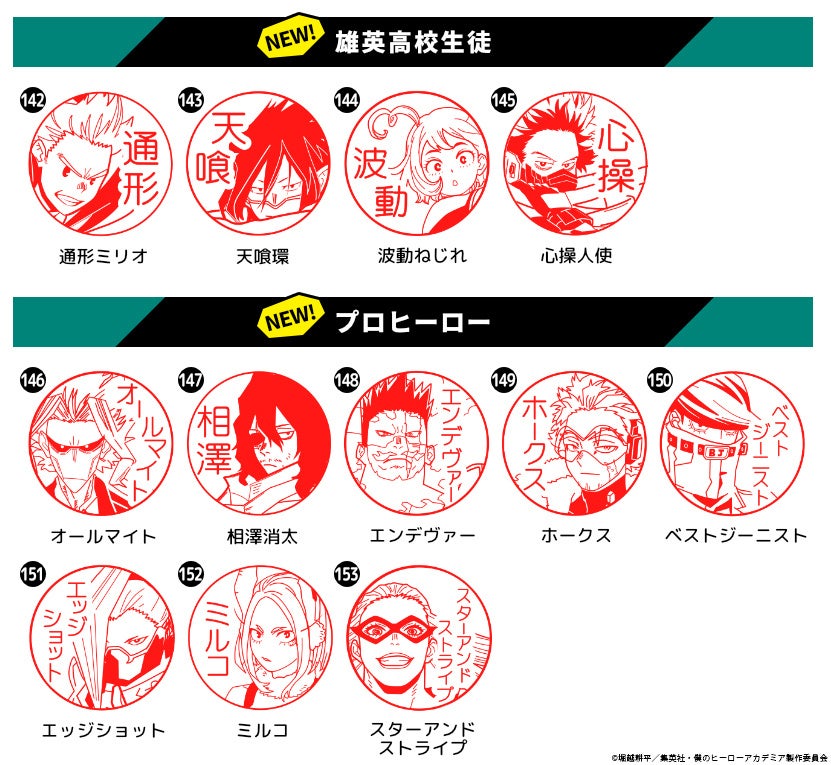 「僕のヒーローアカデミア はんこコレクション」は、コミックスの世界累計発行部数が1億部を突破、週刊少年ジャンプで8月5日に連載を完結したTVアニメ『僕のヒーローアカデミア』のお気に入りのキャラクターと好きな名前や文字でつくれるオーダーメイドのはんこ。雄英高校1年A組、1年B組の生徒からプロヒーロー、敵<ヴィラン>など、これまでSNSから寄せられたリクエストに応えて、キャラクタービジュアルを121種類まで増やしてまいりました。