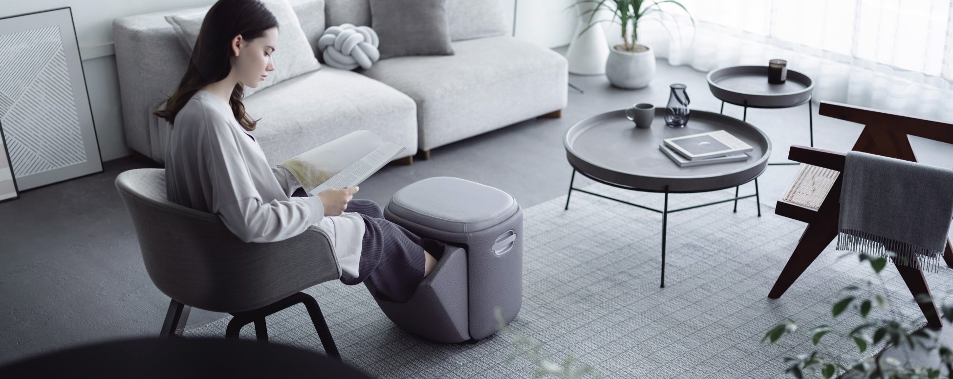 “マッサージとして使用しない時間”にも着目した【3Dフットマッサージャー スツール】は、シンプルなフォルムと落ち着きあるカラーで、どんな空間にもマッチするデザインで、マッサージ器として使わない時はスツールやオットマンとしても使用できます。これまでのグレーと合わせて2色のカラーバリエーションとなり、お部屋の雰囲気に合わせてお選びいただけます。