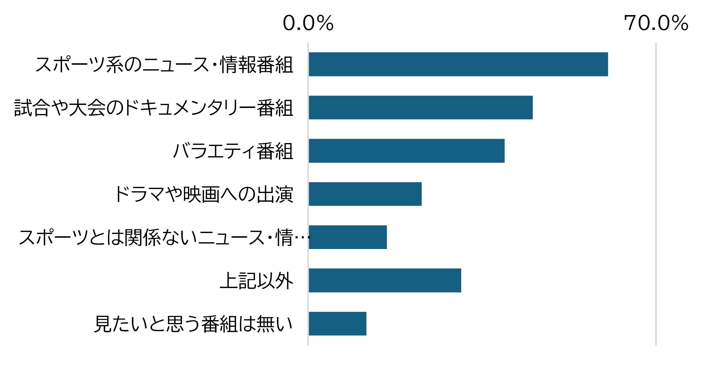 「世界で戦う」アスリートの「チャレンジ精神」をもって「努力し続け」みんなに「夢を与える」に出演してもらいたい番組としては、やはりスポーツ系の番組があげられる一方、バラエティ番組への出演なども興味を持たれています。