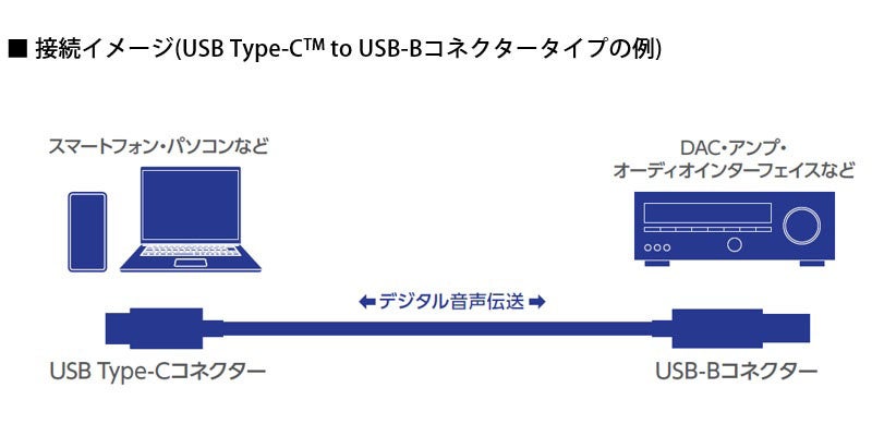 USB Type-C(USB-C)コネクターからの音声入出力に対応したパソコンやスマートフォンと、USB-Bコネクターからの音声入出力に対応した音響機器を接続。高音質デジタル伝送が可能なUSBオーディオケーブルです。