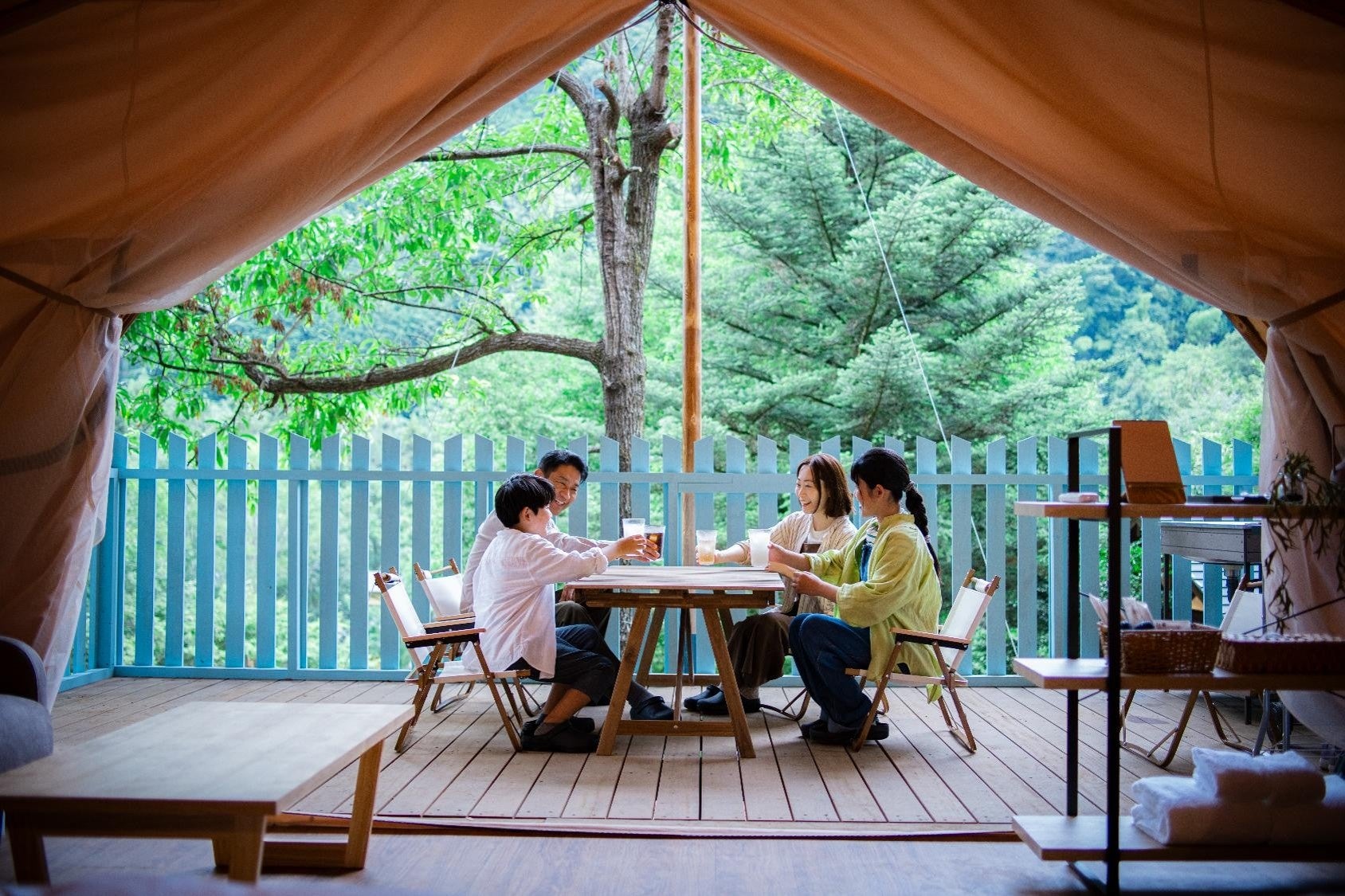 施設には、2種類のテントタイプのほか、バスやシンクを完備したコテージタイプもあり、全て冷暖房完備で一年中快適に過ごせます。また、タオルやアメニティも充実し、キャンプ初心者でも気軽に楽しめます。