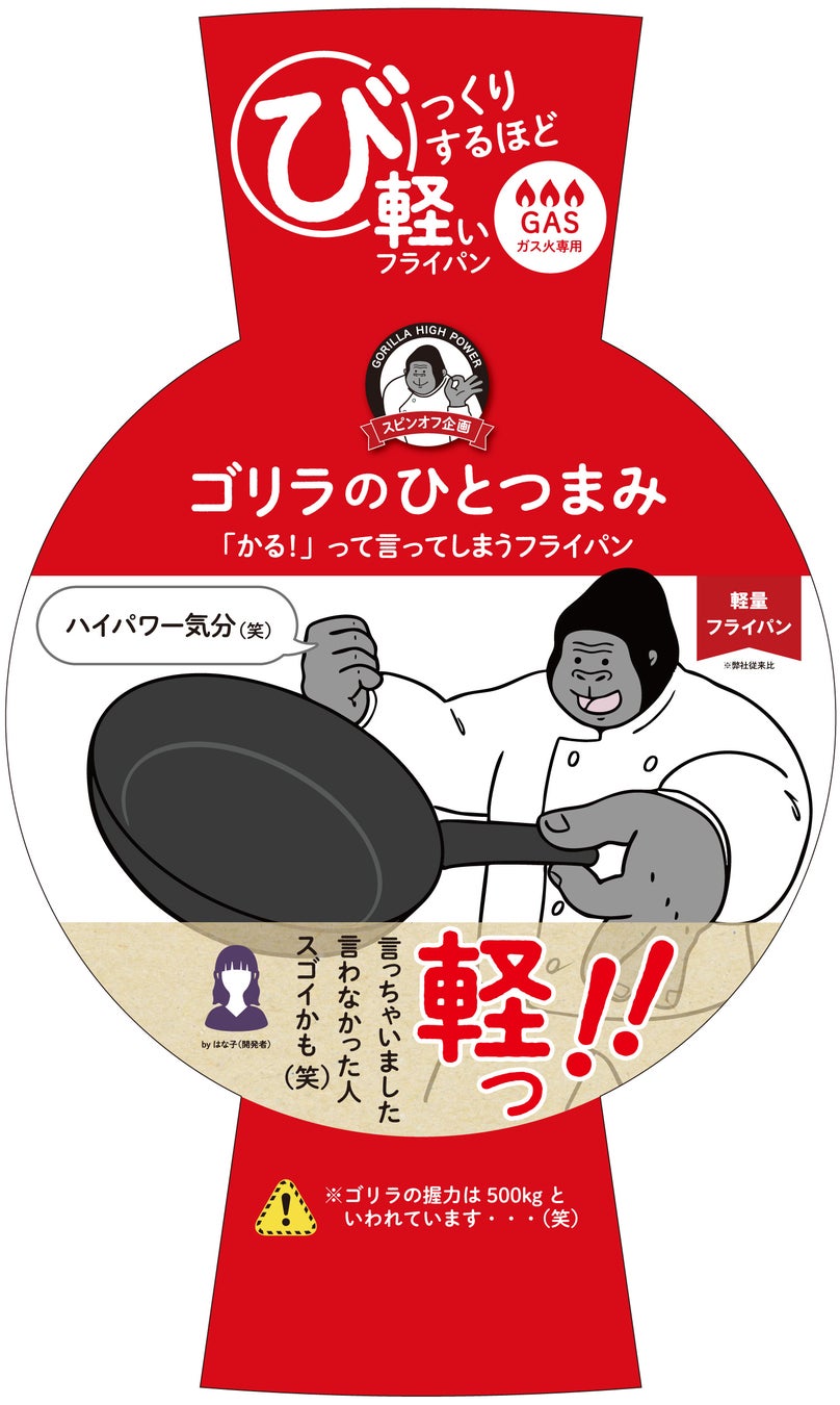 本製品は軽さを追求するために従来のフライパン本体より薄くしました。フライパン26㎝のサイズで重さは375gを実現。一般的な豆腐一丁の重さ(300~400g)と同様の軽さです。本体スリーブはゴリラが人差し指と親指だけで持つイラストを表示することで、軽さを表現し、「軽っ!!言っちゃいました 言わなかった人すごいかも(笑)」とデザインされています。