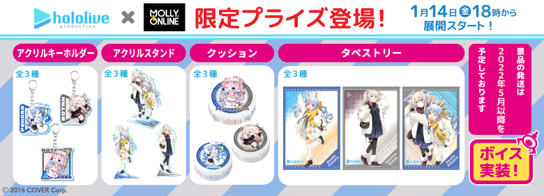 女性VTuberグループ「ホロライブ」、オンラインクレーンゲーム「MOLLY.ONLINE」限定コラボ第9弾として、「兎田ぺこら」「獅白ぼたん」のコラボグッズを1月14日(金)18時から展開開始!