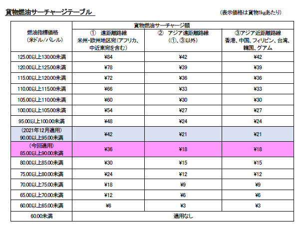 JALは、2022年1月1日から適用となる日本発国際貨物燃油サーチャージを、本日、国土交通省へ申請しました。基準となる2021年11月のジェット燃料の平均価格が1バレル当たり89.10米ドルであったことから、燃油指標価格を「85.00以上90.00未満」とし、サーチャージ額は1kgあたり36円(米州・欧州など遠距離路線)、18円(アジア遠距離路線)、18円(アジア近距離路線)となります。