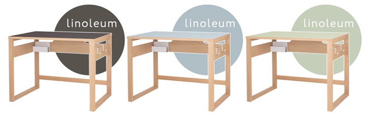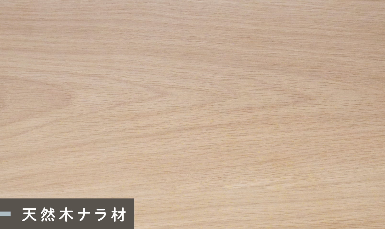 天板は、天然木ナラ突板(ナチュラル)と、亜麻仁油を主成分とした環境配慮素材「リノリウム」の3色、計4色から選べます。ナラ材は耐久性が高く傷がつきにくい一方、繊細で美しい木目がどんな部屋にも自然になじみます。リノリウム天板は抗菌性・耐久性を備え、しっとりとした手触りが特徴です。好みや空間の雰囲気に合わせて、長く愛せる質感を選ぶことができます。