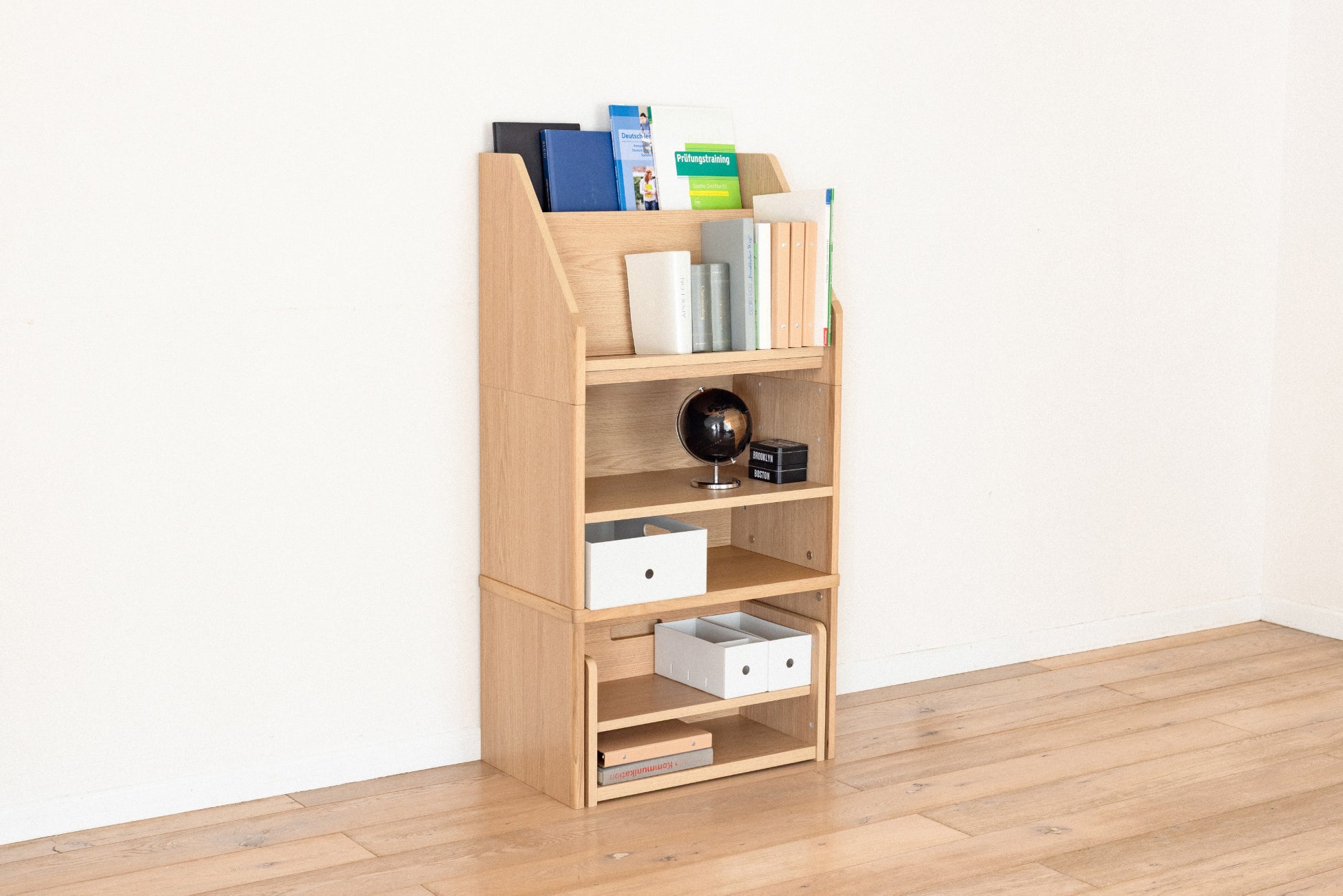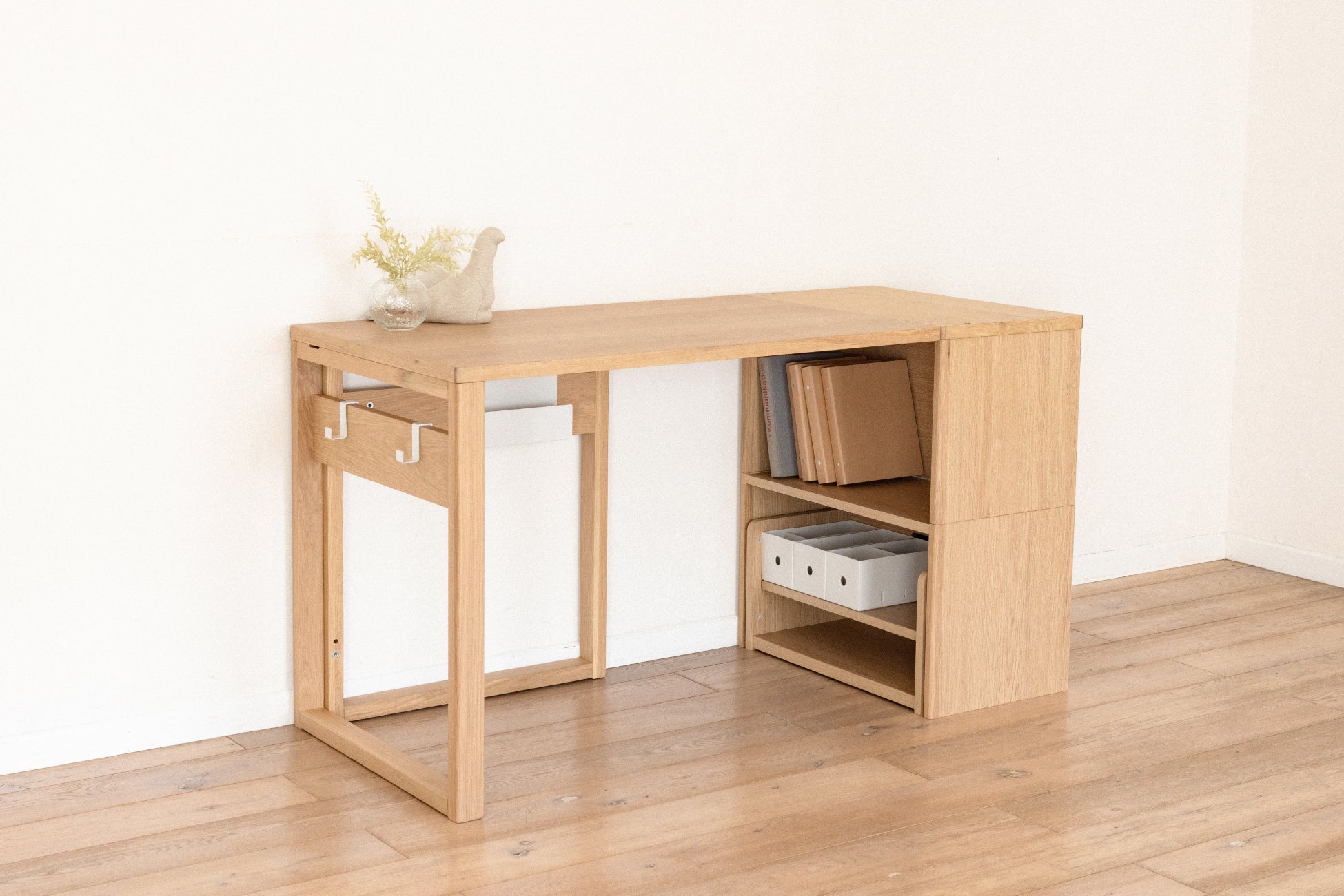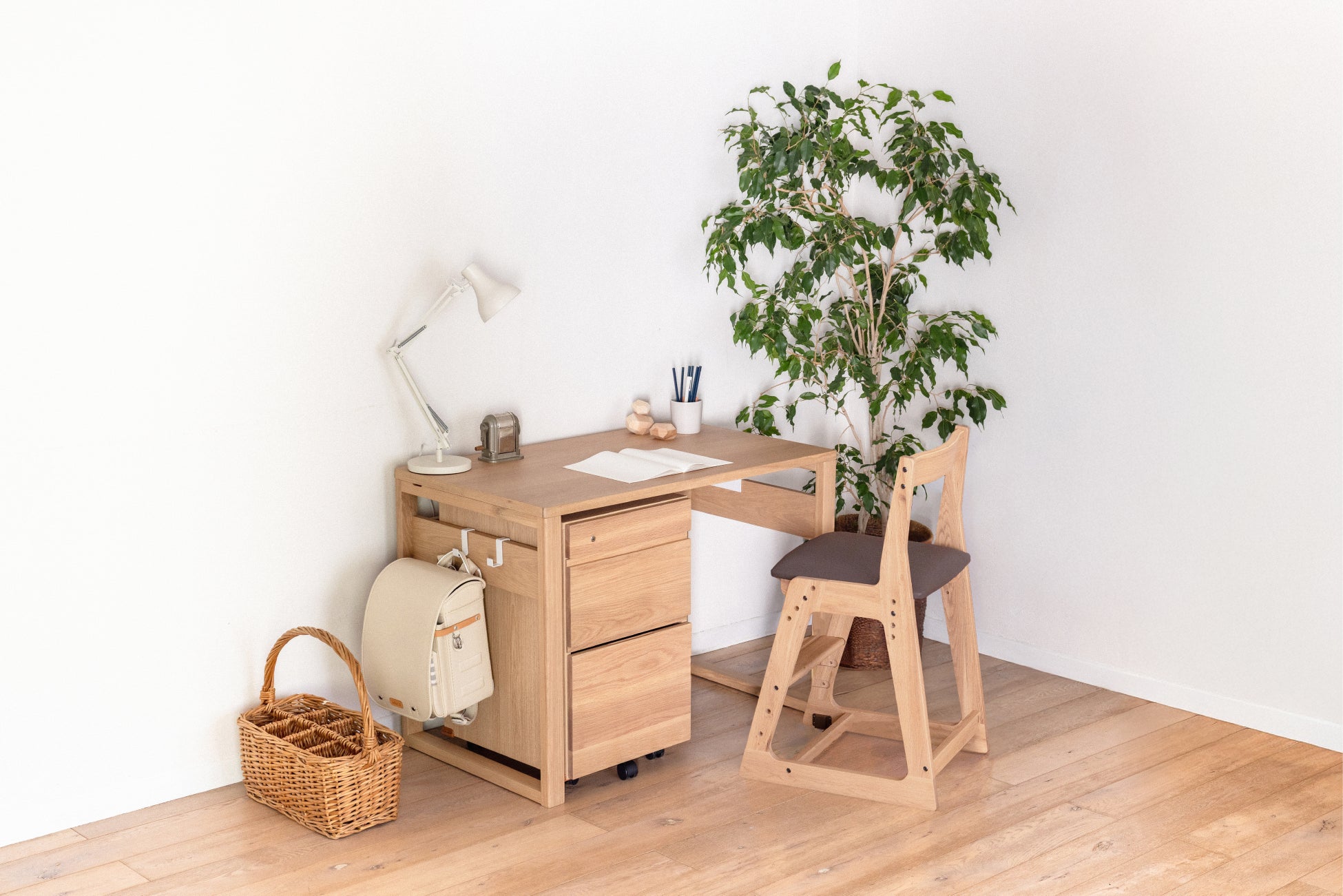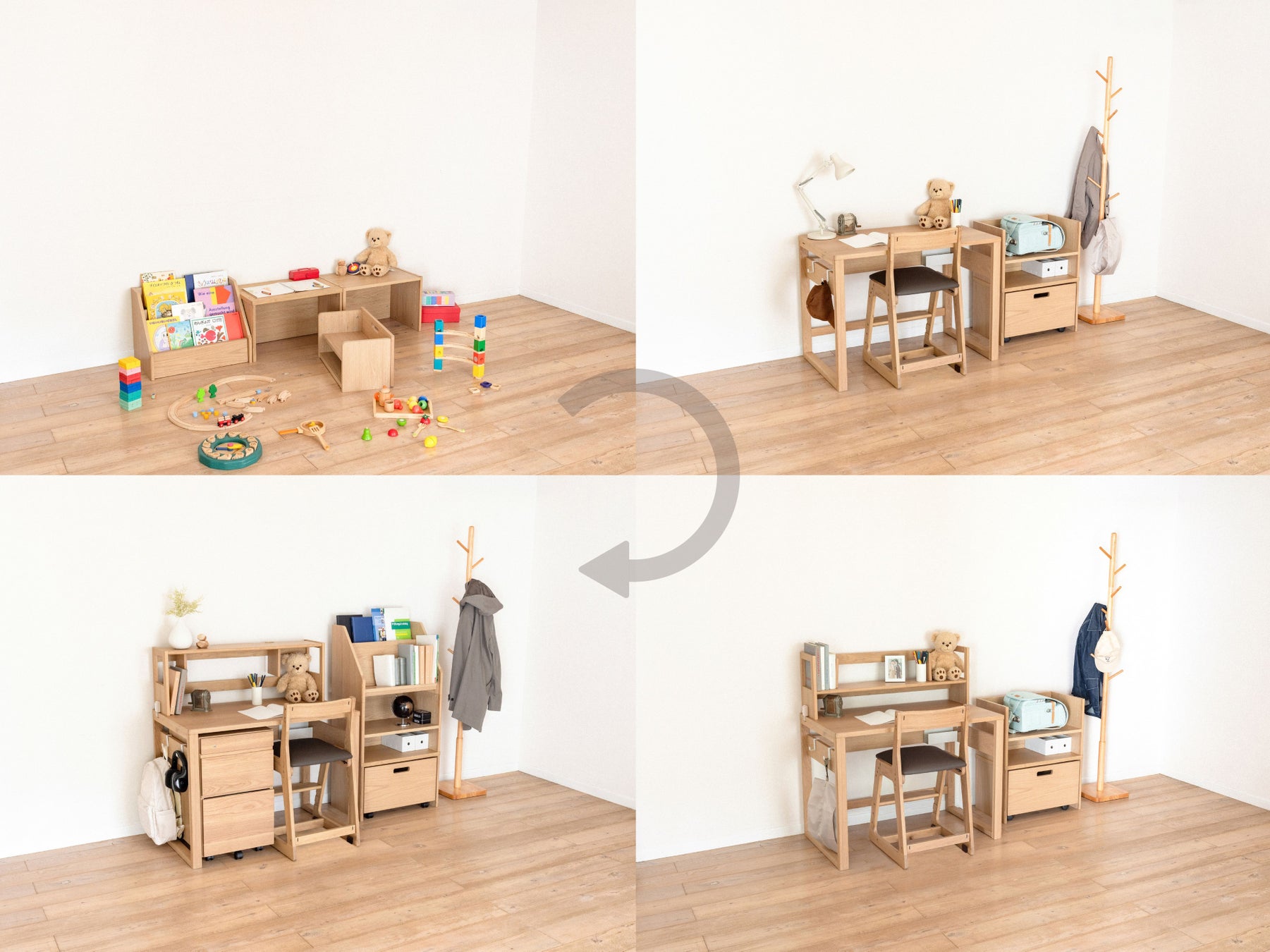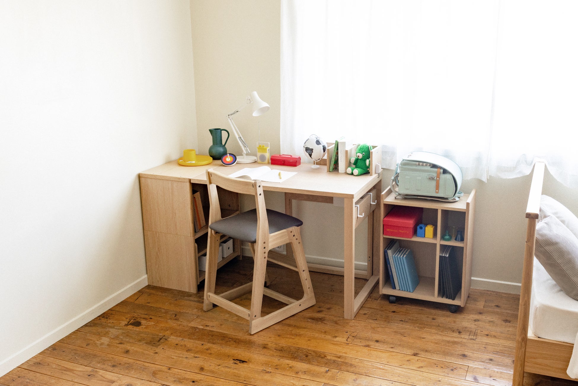 未就学児向けのキッズデスクは、成長後には形を変えて収納ラックとして使い続けられるなど、ライフステージに応じて用途を変えられる設計です。収納アイテムも必要なタイミングで買い足せるため、年齢とともに増えていく持ち物にも柔軟に対応でき、最適な環境を無理なくつくることができます。