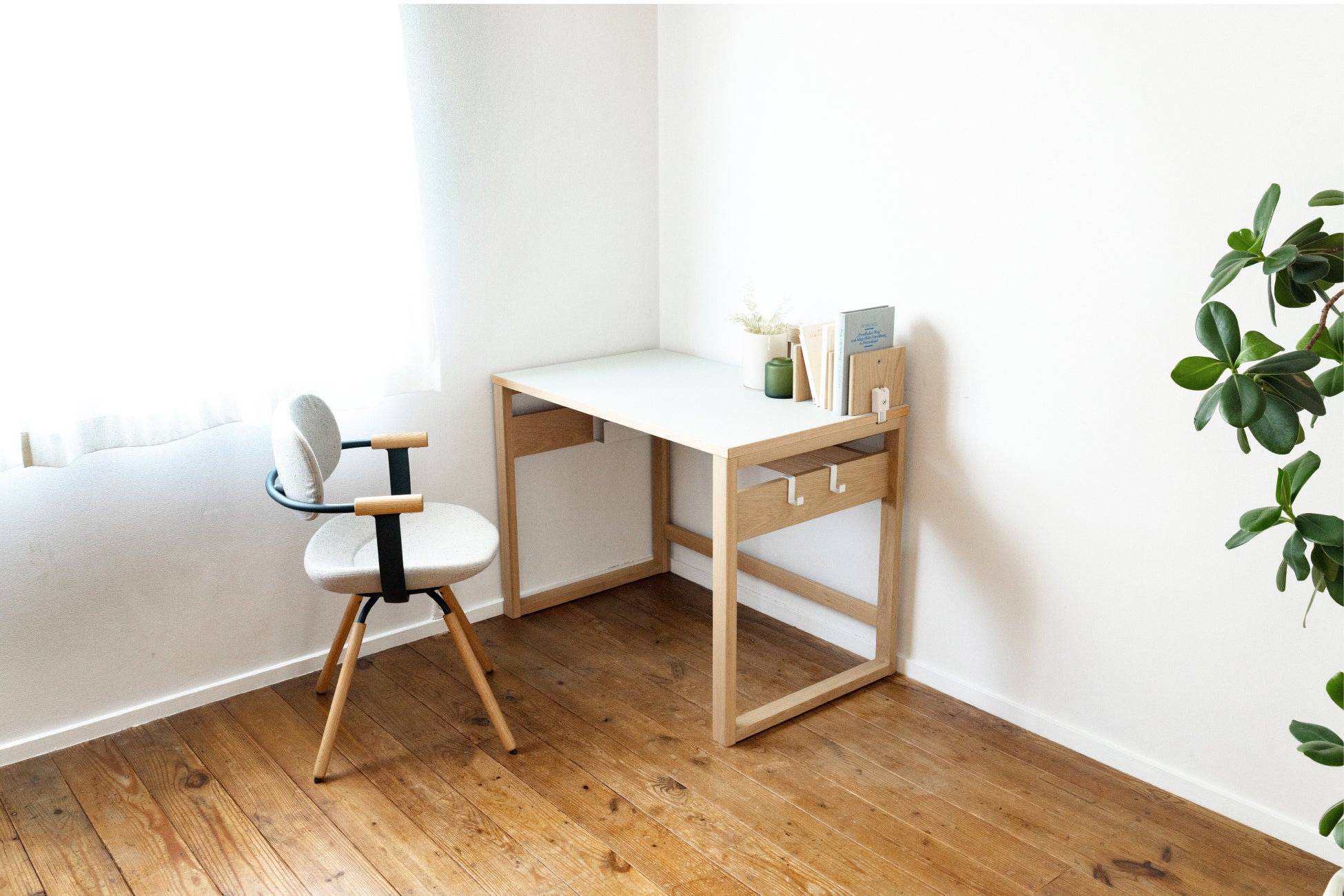 クレッタシリーズのデスクは、横から見たときにロの字型の脚部が生み出す “すっきりとした四角いシルエット”が特徴のシンプルで軽やかなデザインです。余計な装飾を省いた端正な形は、リビングにも子ども部屋にも自然になじみ、空間を圧迫しません。北欧・モダン系のインテリアとも相性が良く、成長してからも長く使い続けられる、飽きのこない佇まいを目指しました。