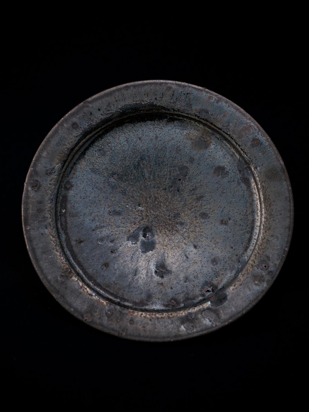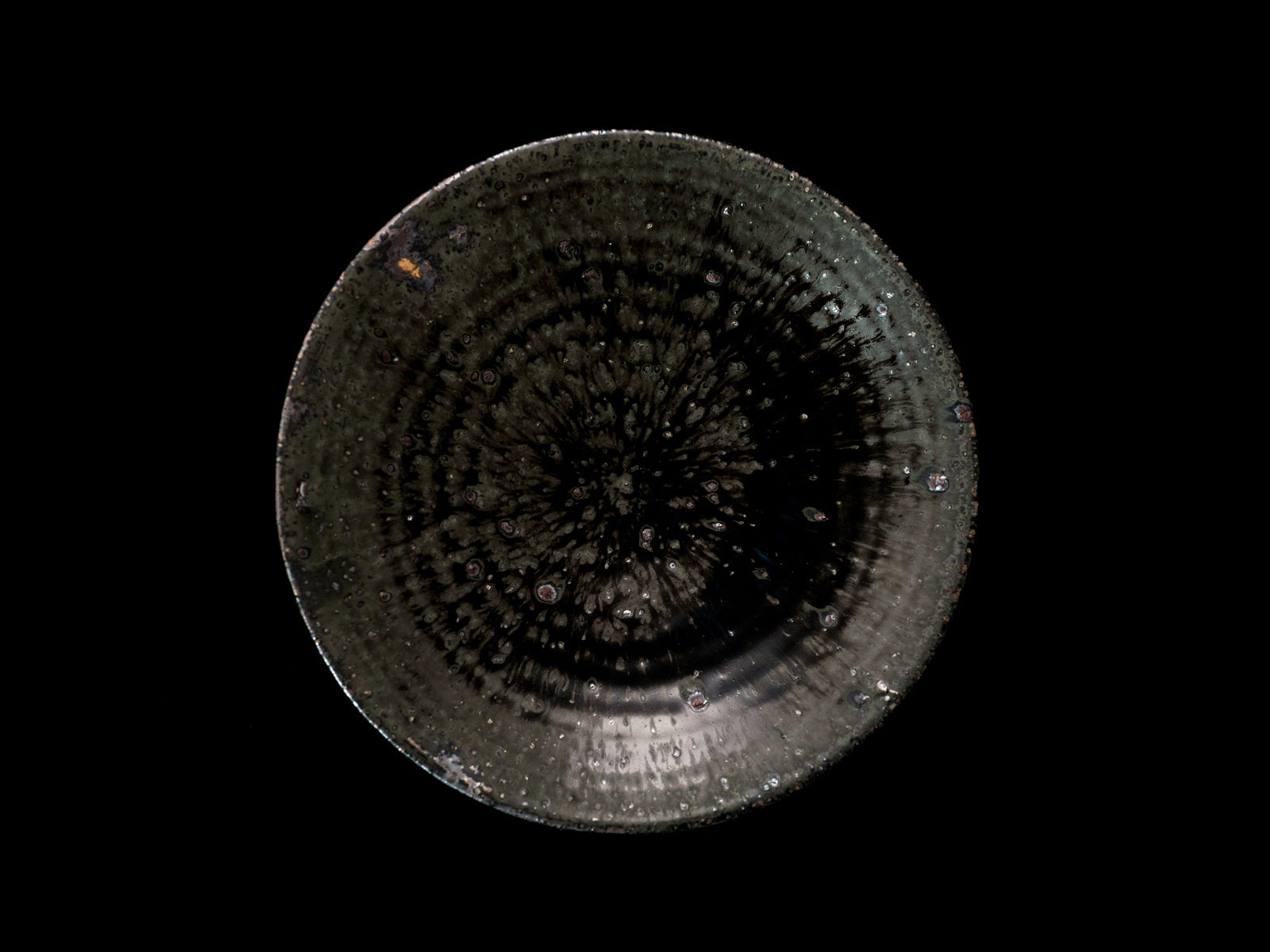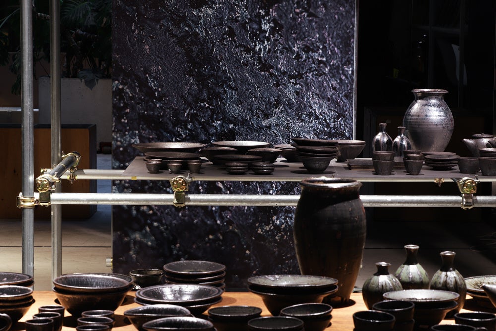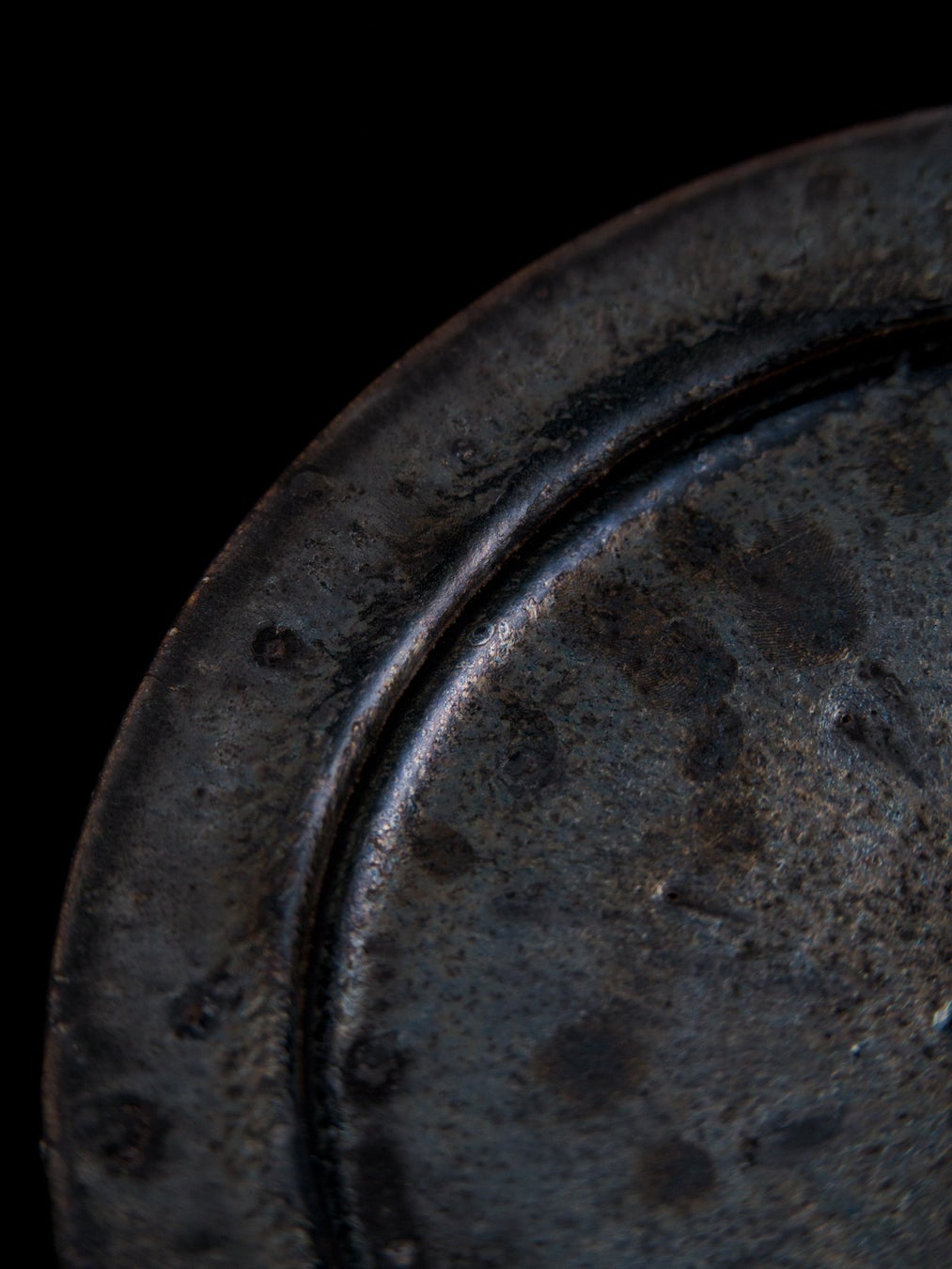 日本の伝統的な志野釉に鉄分を加え、長時間の焼成を5回繰り返すことで鉄分が染み出した、独特のテクスチャーと深みのある黒。青と金色、マットとメタリックの結晶が何層にも重なり織りなす色は、角度によってその輝きを変え、しっとりとした質感もまた魅力のひとつです。フラットな形状のリム皿は、本展にてお披露目する新作となります。