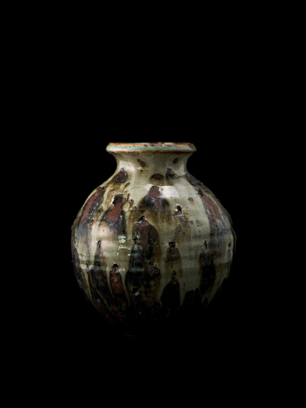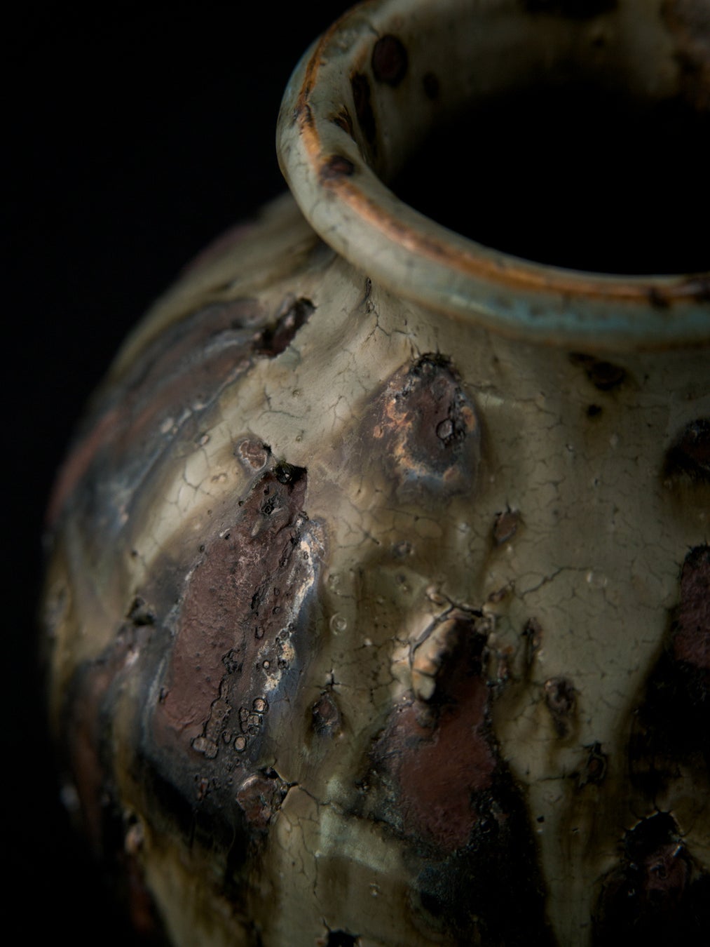 白化粧は粉引とも呼ばれ、赤土や黒土で作った土台の上に、白い泥と釉薬をかけて焚いています。焼成の回数を増やし、ところどころに見られる鉄点をより激しく噴出させ、表面を覆うような土味を感じる表情と、うっすらと緑や青みを感じる白化粧のコントラストが美しい壺です。