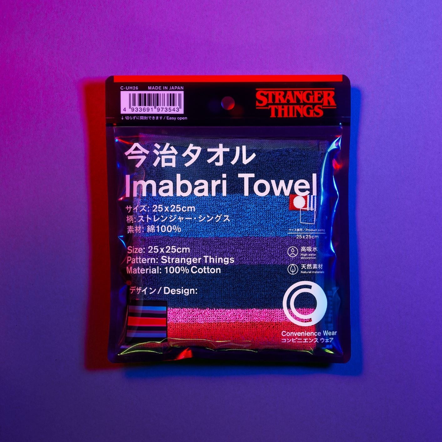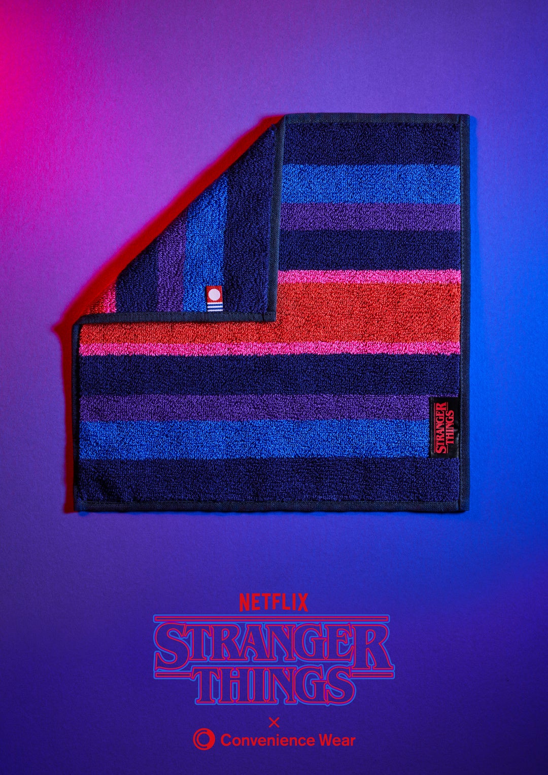 【内容】「今治タオル」クオリティの高吸水仕様です。「ストレンジャー・シングス 未知の世界4」のポスターカラーをモチーフに配色し、ストレンジャー・シングスのオリジナルタグを付けました。