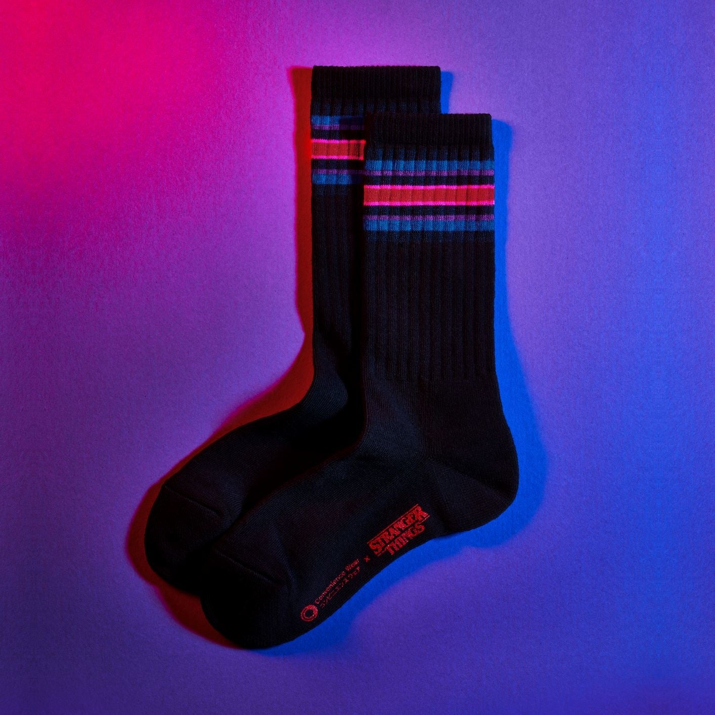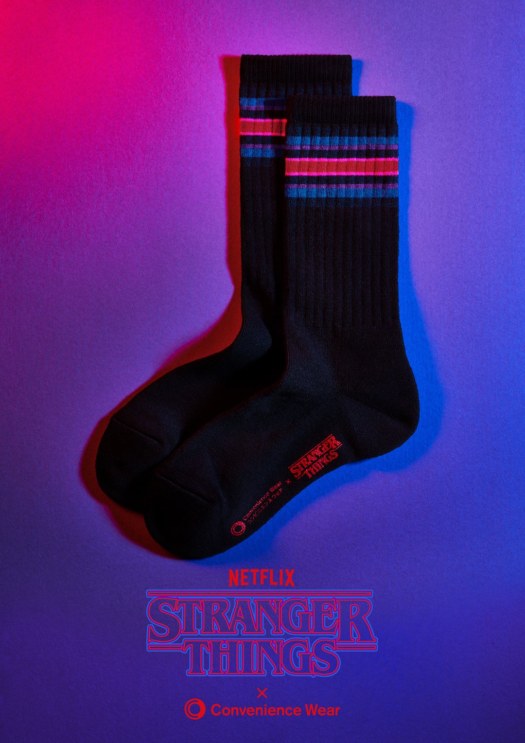 【内容】「ストレンジャー・シングス 未知の世界4」のポスターカラーをモチーフに配色し、足底にはコンビニエンスウェア、ストレンジャー・シングスのWネームのラバープリントを施しております。