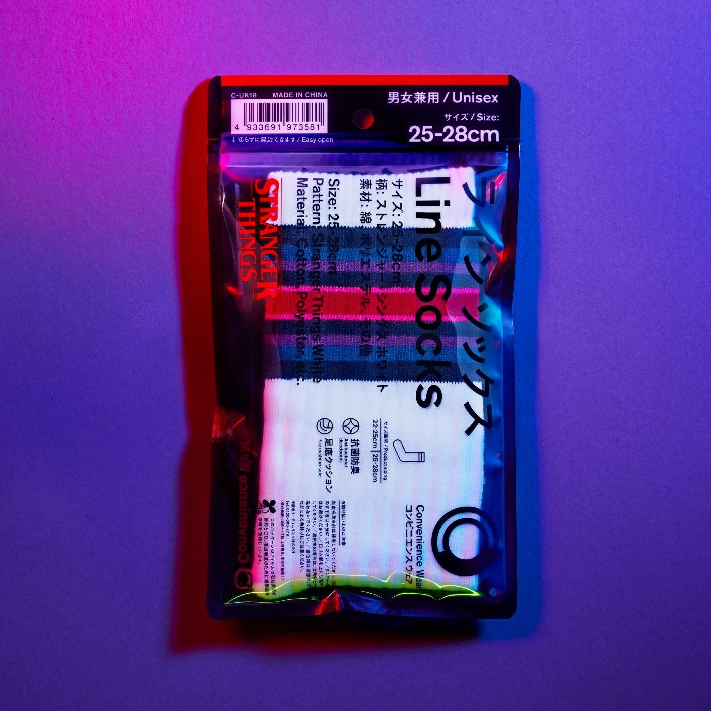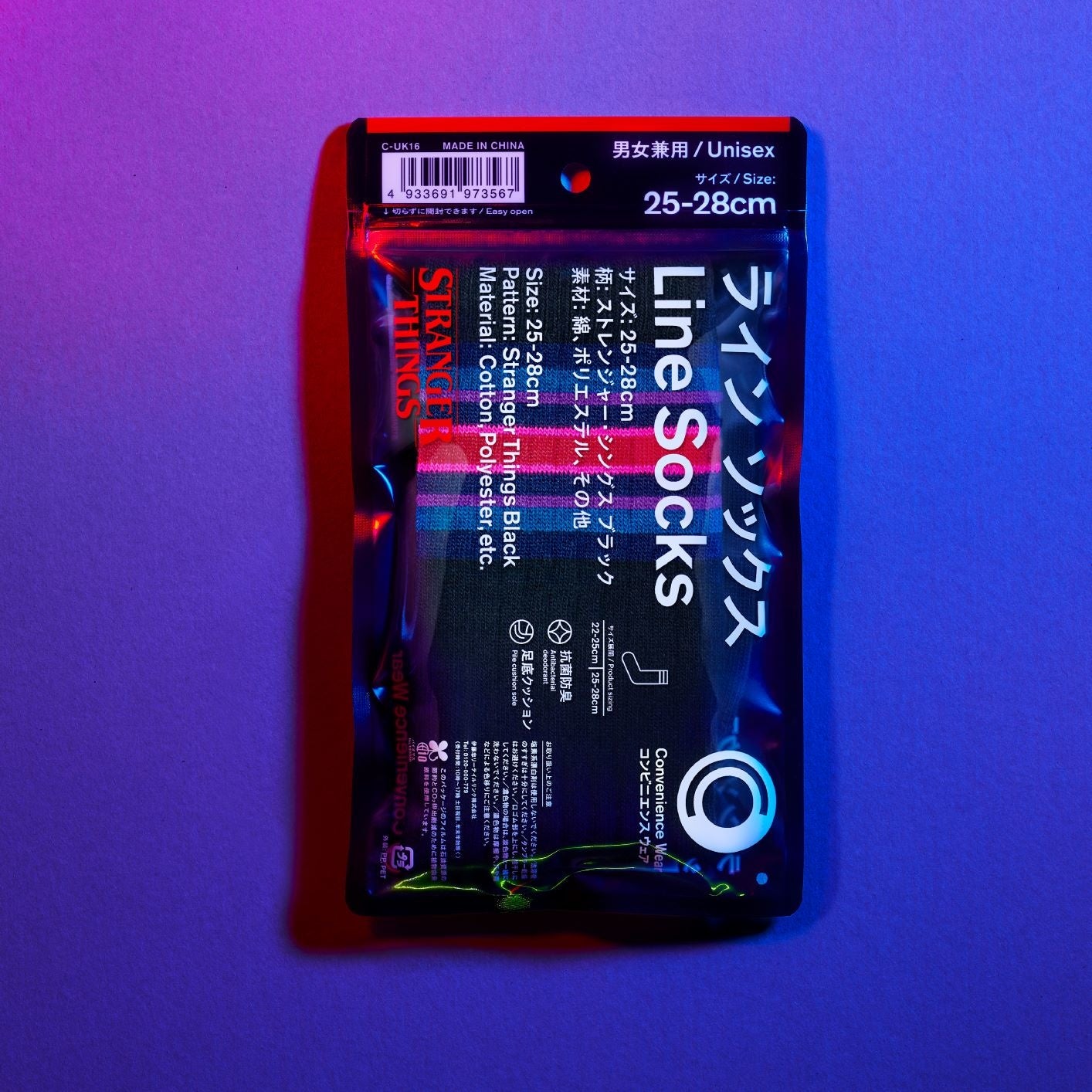 「ストレンジャー・シングス 未知の世界4」の世界観をイメージしたダークながらもレトロポップなデザインに仕上げております。「ラインソックス」はラインの幅の中でストレンジャー・シングスの世界観を表現しました。また、「ストレンジャー・シングス」と「コンビニエンスウェア」のWネームのロゴを入れ、特別感のある仕様になっております。「今治タオルハンカチ」もラインソックスと同様に「ストレンジャー・シングス」の世界観を柄で表現し、オリジナルのタグを付けて特別感のある仕様になっております。