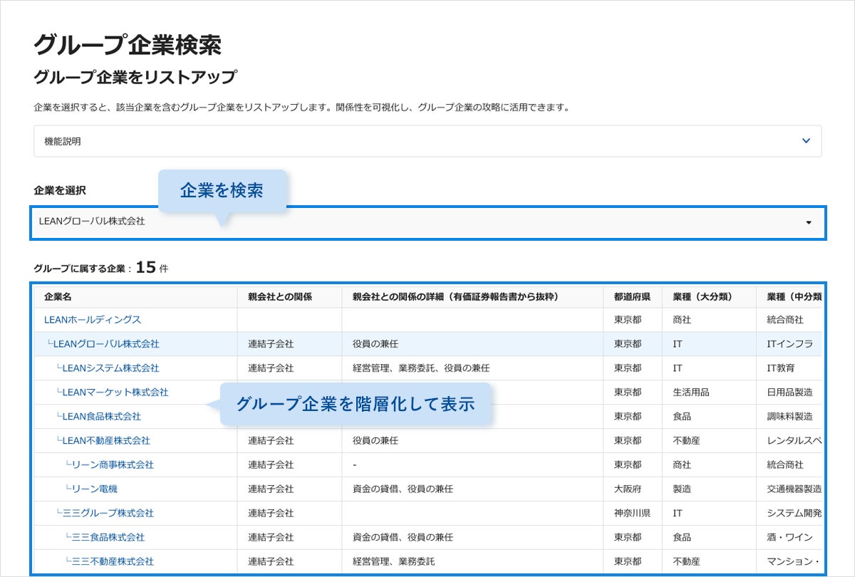 企業名を入力すると、有価証券報告書における資本状況を基に、該当企業を含むグループ企業が一覧で表示される機能です。親会社・子会社の関係性や、従業員数・所在都道府県なども表示されるため、営業を担当する領域のグループ企業を簡単に発見できます。