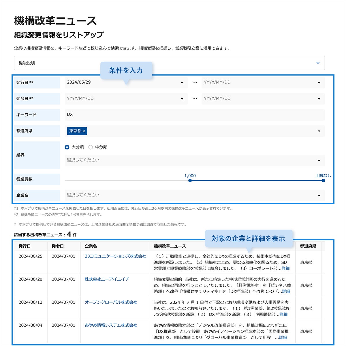 部署の新設・改名および統廃合など、組織改編の情報をリストアップできる機能です。直近で発生した組織改編の情報を一覧化するほか、発令日やキーワード等から検索することも可能です。組織改編が行われると、新しくITツールやオフィス設備などが必要になる場合があるほか、新規プロジェクトの立ち上げなどによって投資が活発になるケースがあります。本機能を活用することで、そうした新たな需要が発生しそうな企業を発見できます。