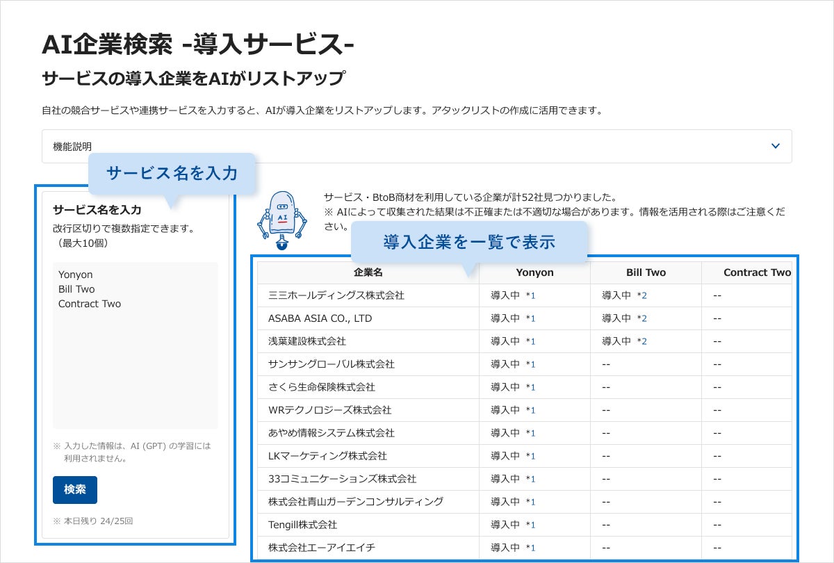 商品・サービス名を入力すると、Web情報から該当するサービスを導入している企業をリストアップします。競合サービスや、自社と連携しているサービスを導入している企業を検索することで、新規開拓における優先度が高い企業を発見できます。