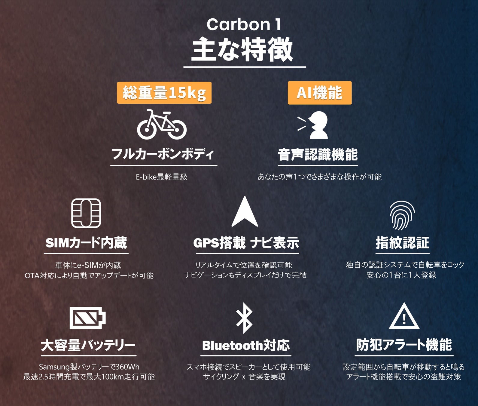 カーボンを使用したE-bikeは市場にもありますが、ハンドルやシートなど部分的に採用していることが多く軽くても17㎏~20kgが多く購入を悩むことも多々...『Carbon 1』はボディ全体にカーボンファイバーを使用することで15kgまで軽量化を実現させました。