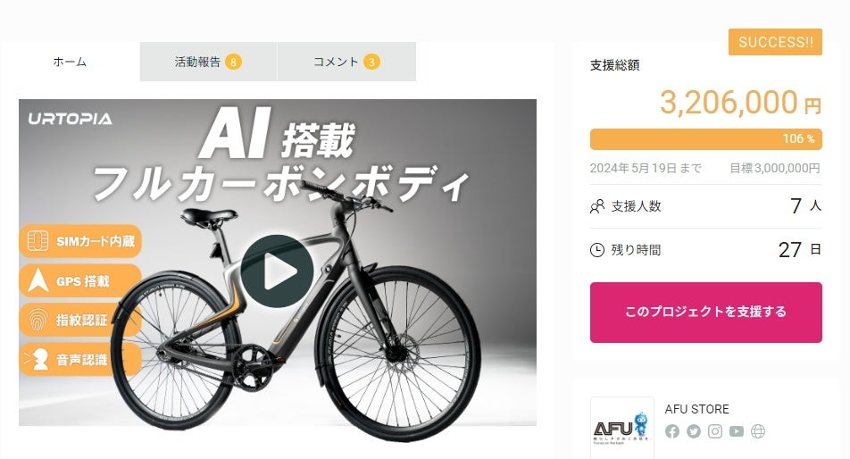 AI搭載E-bike『URTOPIA Carbon1』が本日4月22日(月)に目標達成!