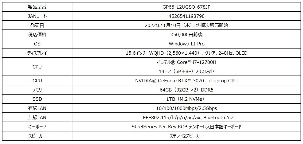 この度、エムエスアイコンピュータージャパン株式会社は、大容量64GB DDR5メモリとハイエンドグラフィックス機能「NVIDIA® GeForce RTX™ 3070 Ti Laptop GPU」を搭載したゲーミングノートPC「GP66-12UGSO-678JP」をMSI公式オンラインストア(以下、MSIストア)限定で2022年11月10日(木)より発売いたします。