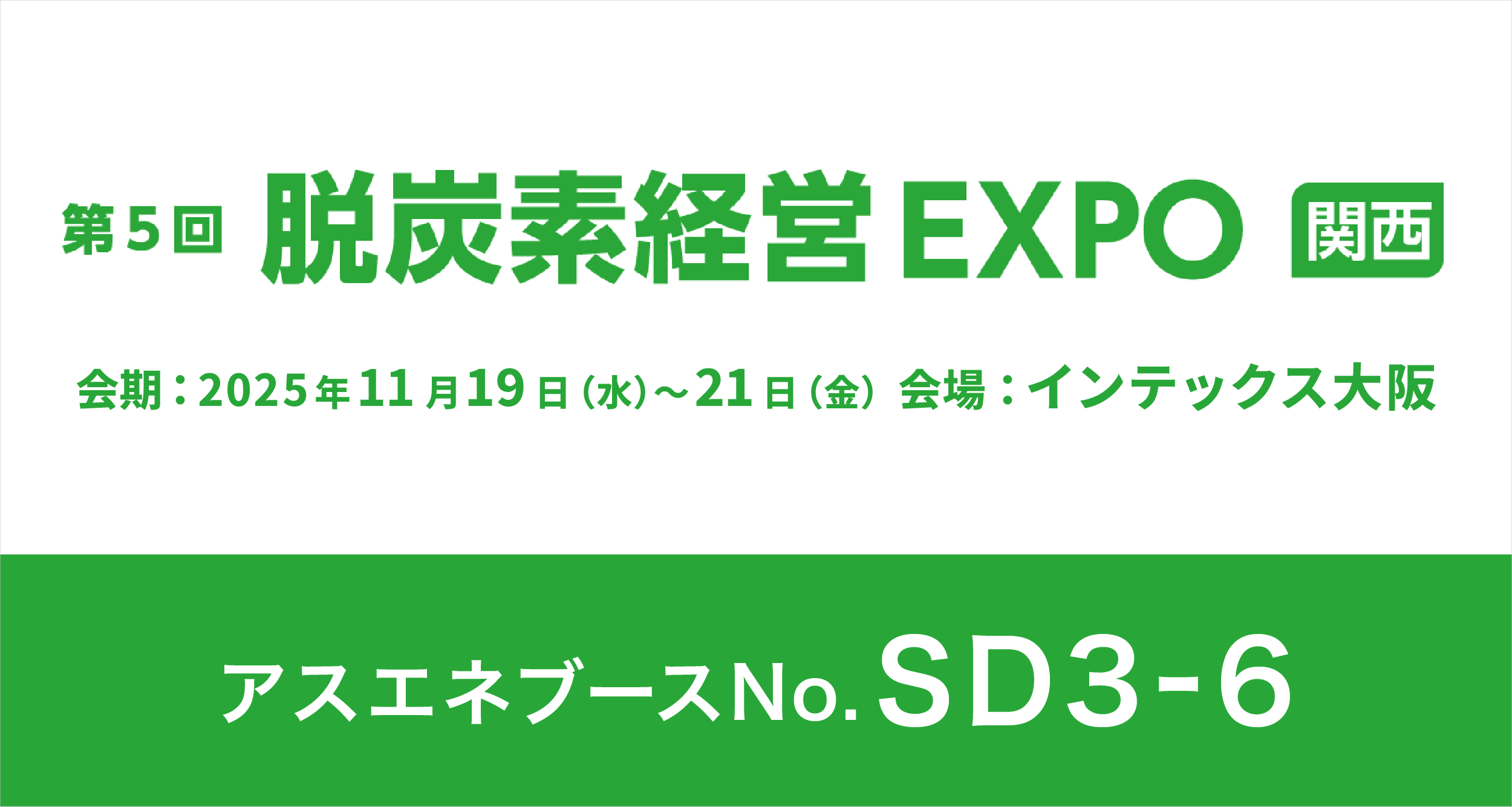 アスエネ株式会社(本社:東京都港区、代表取締役CEO:西和田 浩平、以下「当社」)は、2025年11月19日(水)から21日(金)にインテックス大阪で開催される「脱炭素経営EXPO【関西】」に出展します。