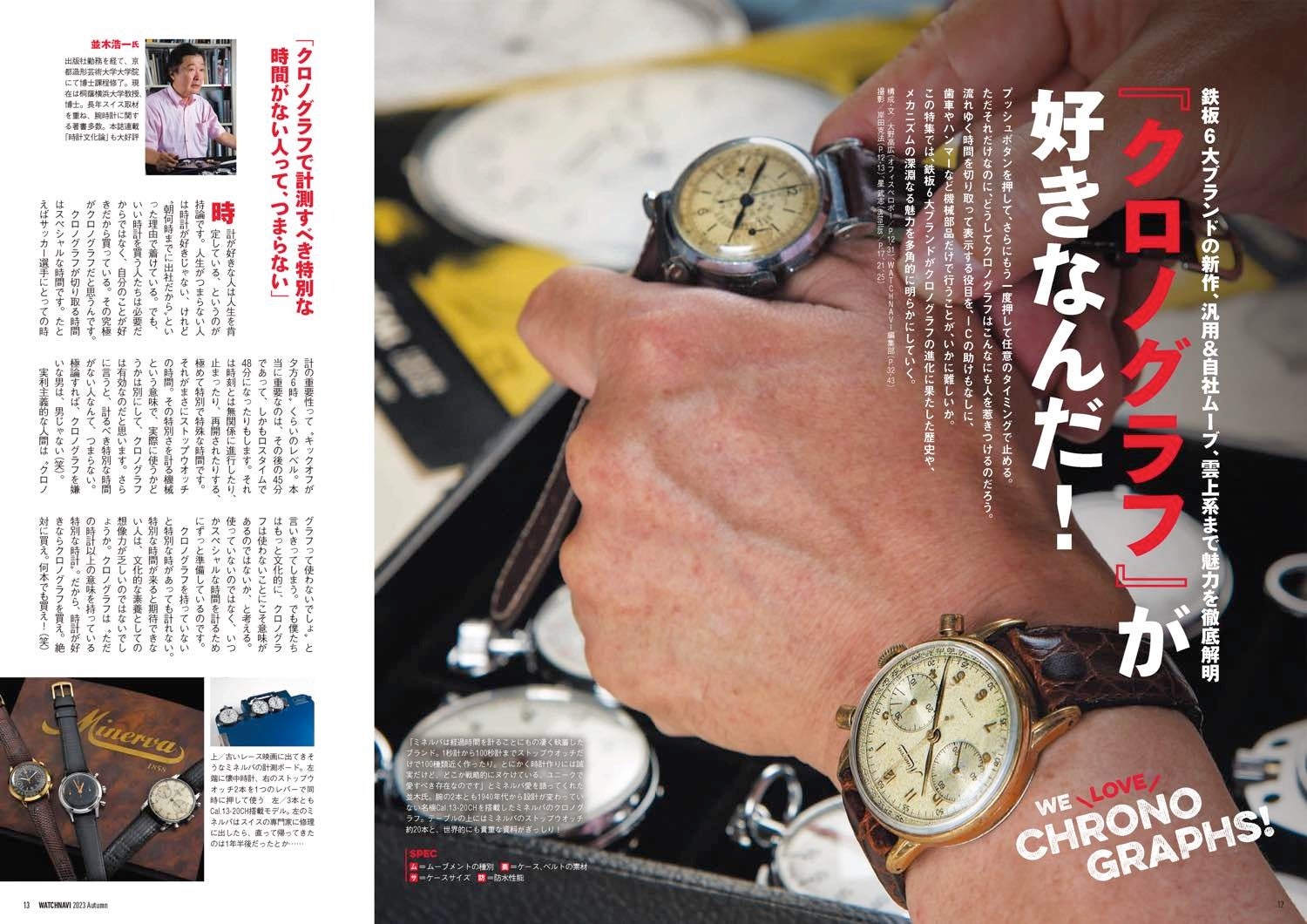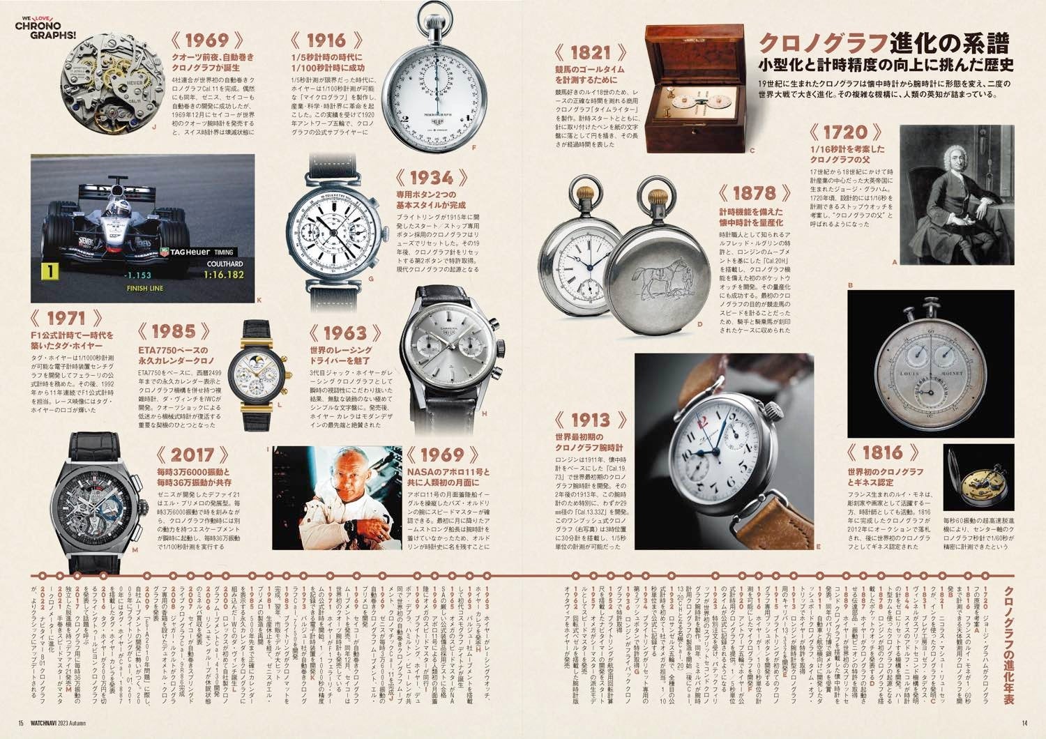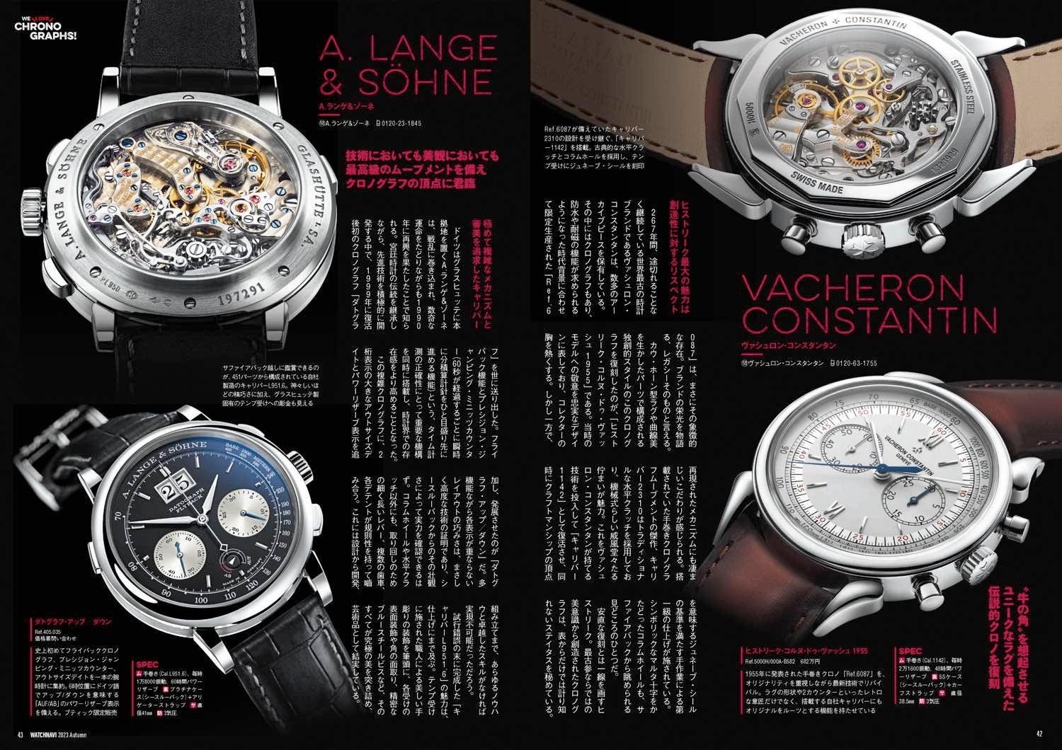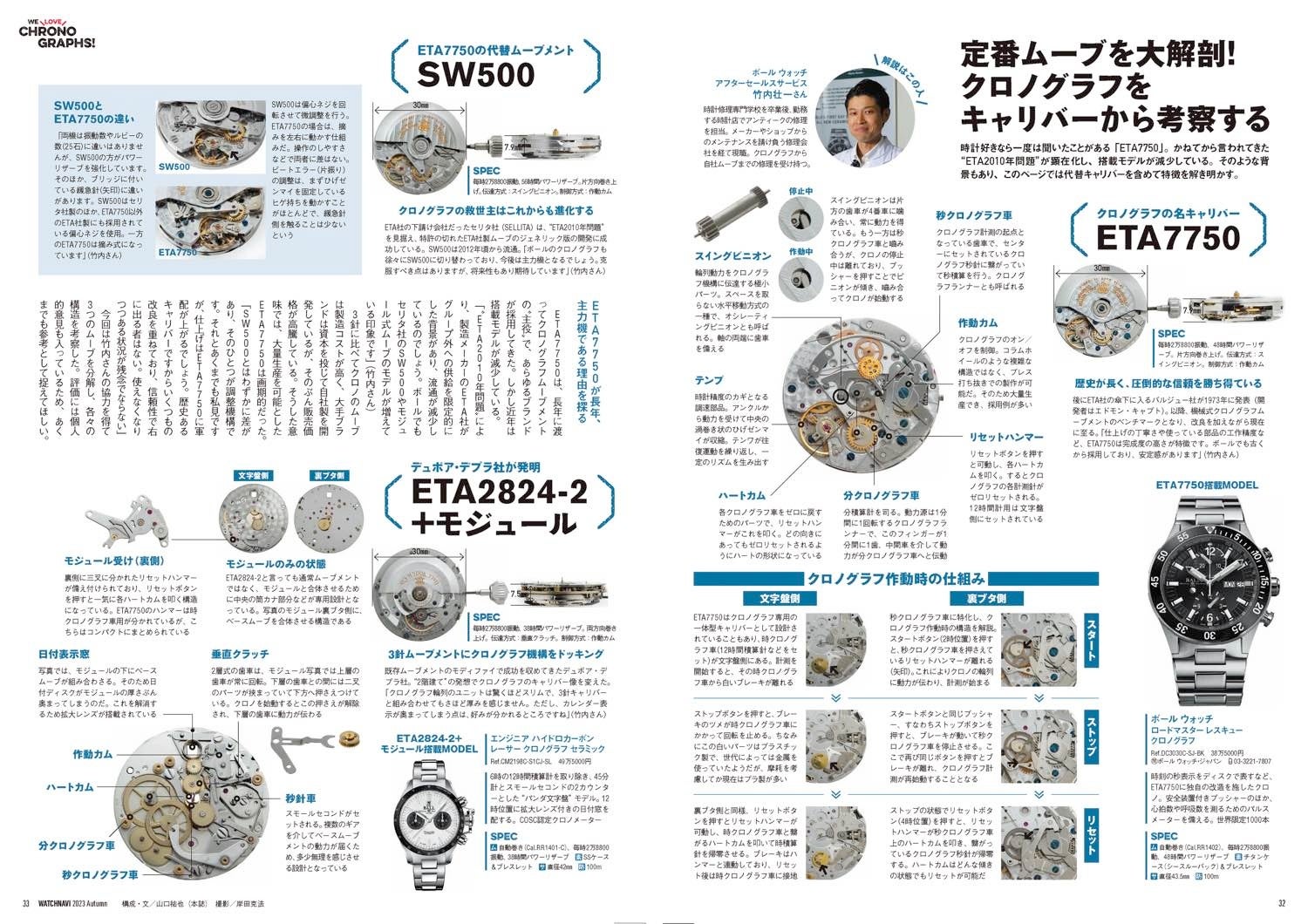 巻頭特集は、ロレックス、オメガ、タグ・ホイヤー、ブライトリングら6大クロノグラフブランドの新作/定番モデル解説に機構開発史、名機ETA7750や各ブランドの自社開発ムーブメント事情などを徹底検証!