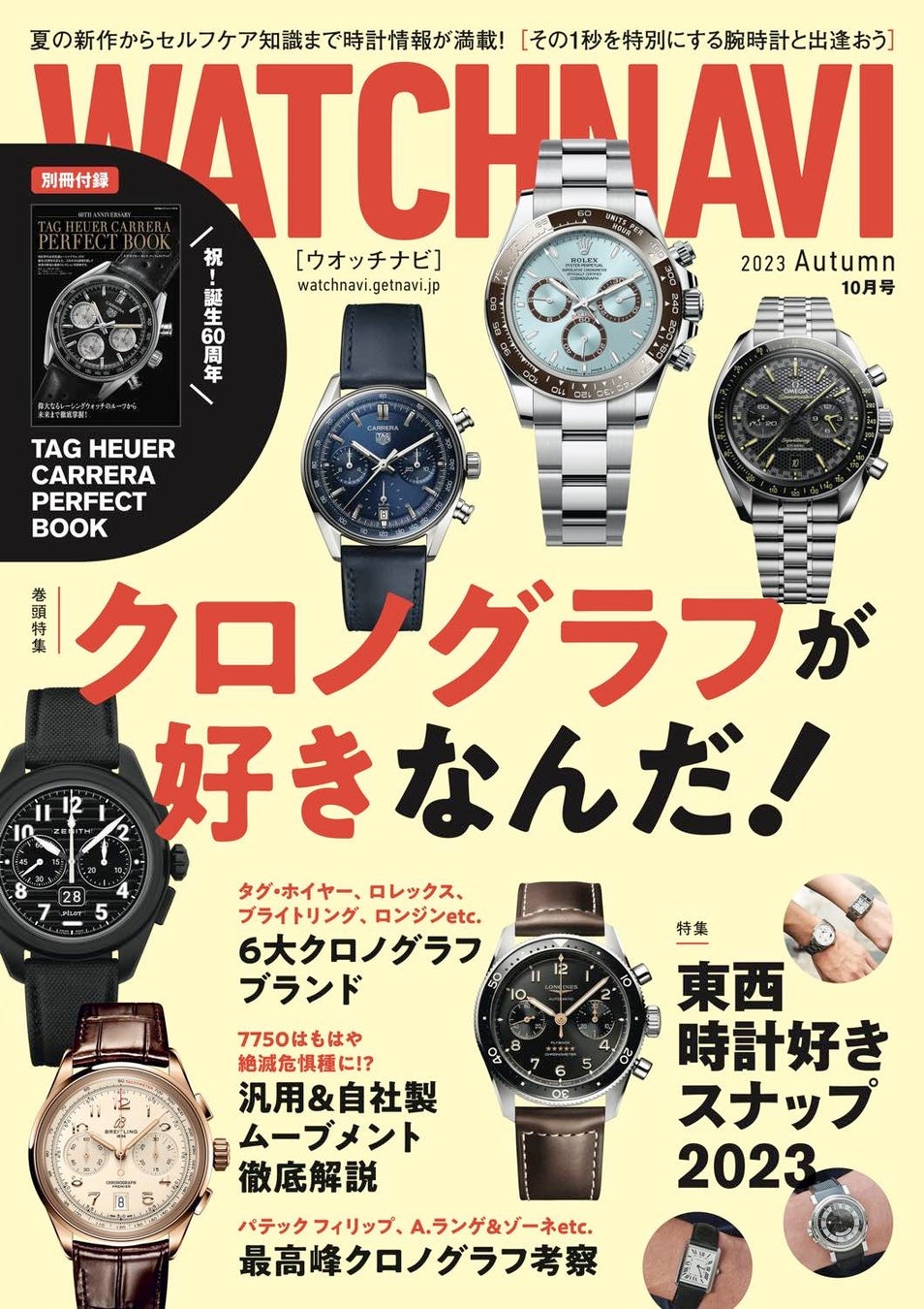 印刷版は、誕生60周年を迎えた名作の歴史と最新事情に迫った「タグ・ホイヤー カレラ パーフェクトブック」の別冊付録付き!