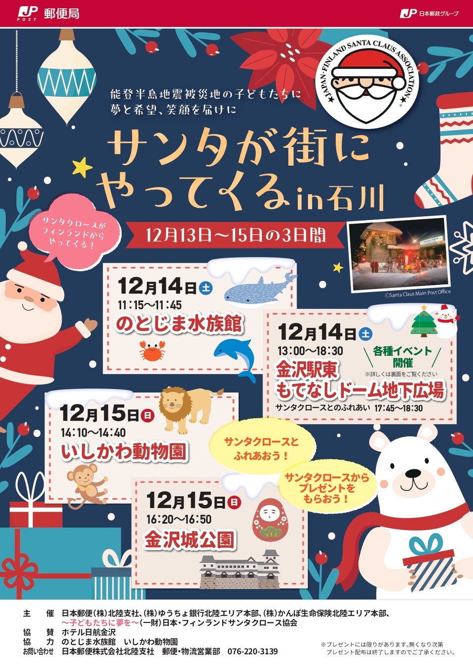 主 催:日本郵便(株)北陸支社様、(株)ゆうちょ銀行北陸エリア本部様、(株)かんぽ生命保険北陸エリア本部様、~子どもたちに夢を~(一財)日本・フィンランドサンタクロース協会様