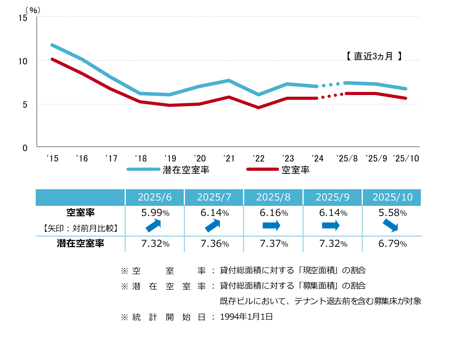 空室率は前月比マイナス0.56ポイントの5.58%となり、前月から大幅に低下した。主要エリアでの分室の開設や取壊し予定ビルでの外部募集の停止が主な低下要因となっている。規模別では「大規模」が前月比マイナス1.0ポイントの大幅な低下となった。潜在空室率は前月比マイナス0.53ポイントの6.79%だった。